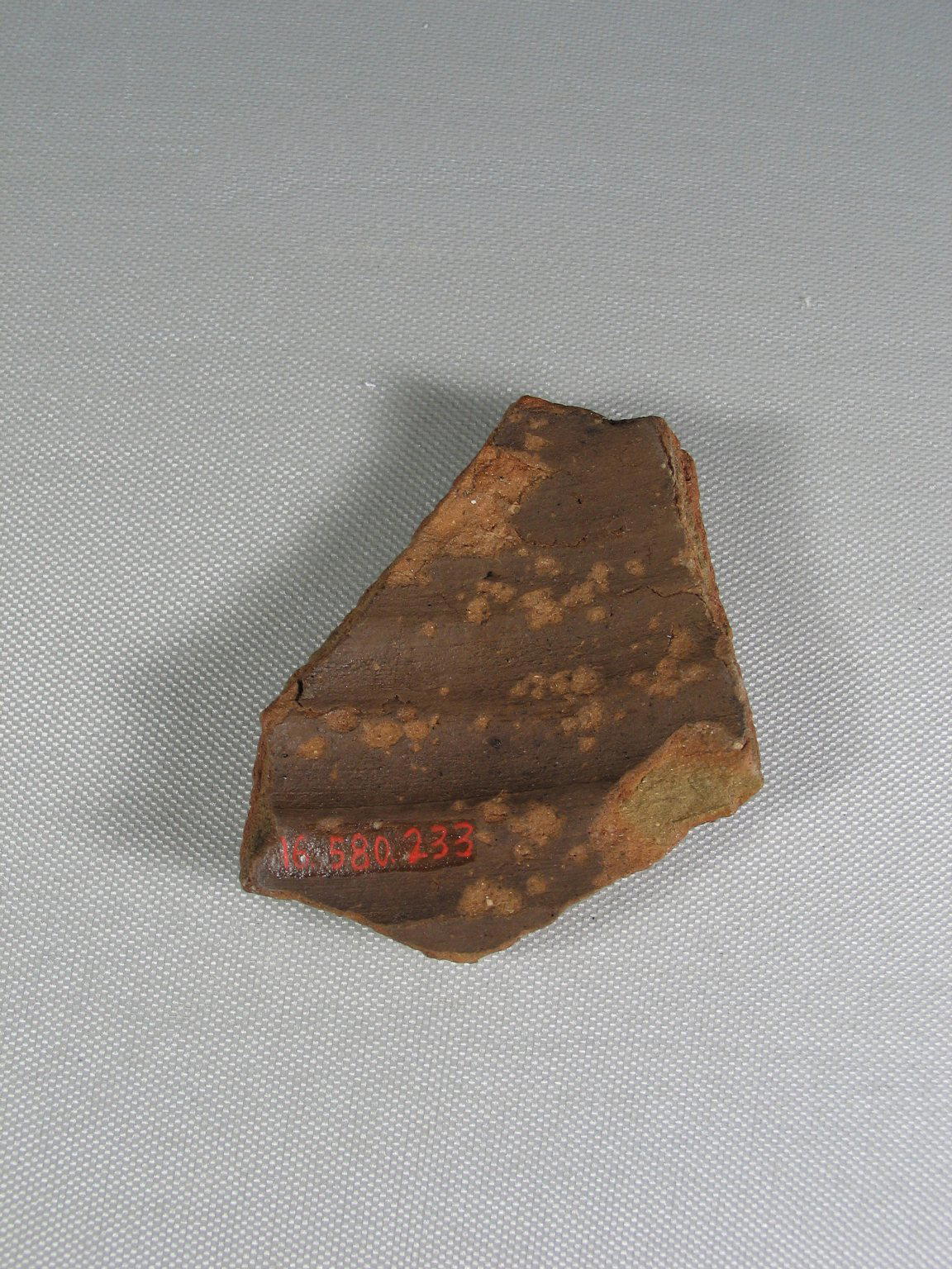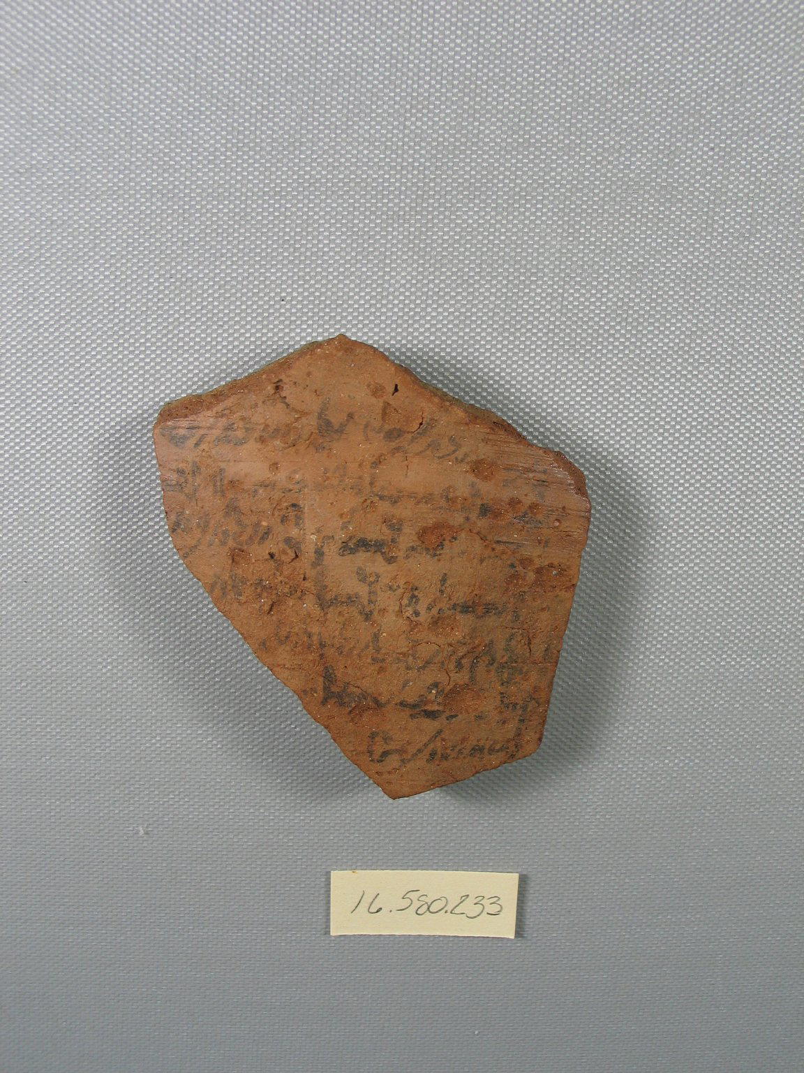 Demotic Ostracon, Year 7 (?) or 8 (?) of Tiberius. Terracotta, pigment, 2 3/4 x 3/8 x 3 1/8 in. (7 x 1 x 8 cm). Brooklyn Museum, Gift of Evangeline Wilbour Blashfield, Theodora Wilbour, and Victor Wilbour honoring the wishes of their mother, Charlotte Beebe Wilbour, as a memorial to their father, Charles Edwin Wilbour, 16.580.233. (Photo: Brooklyn Museum)