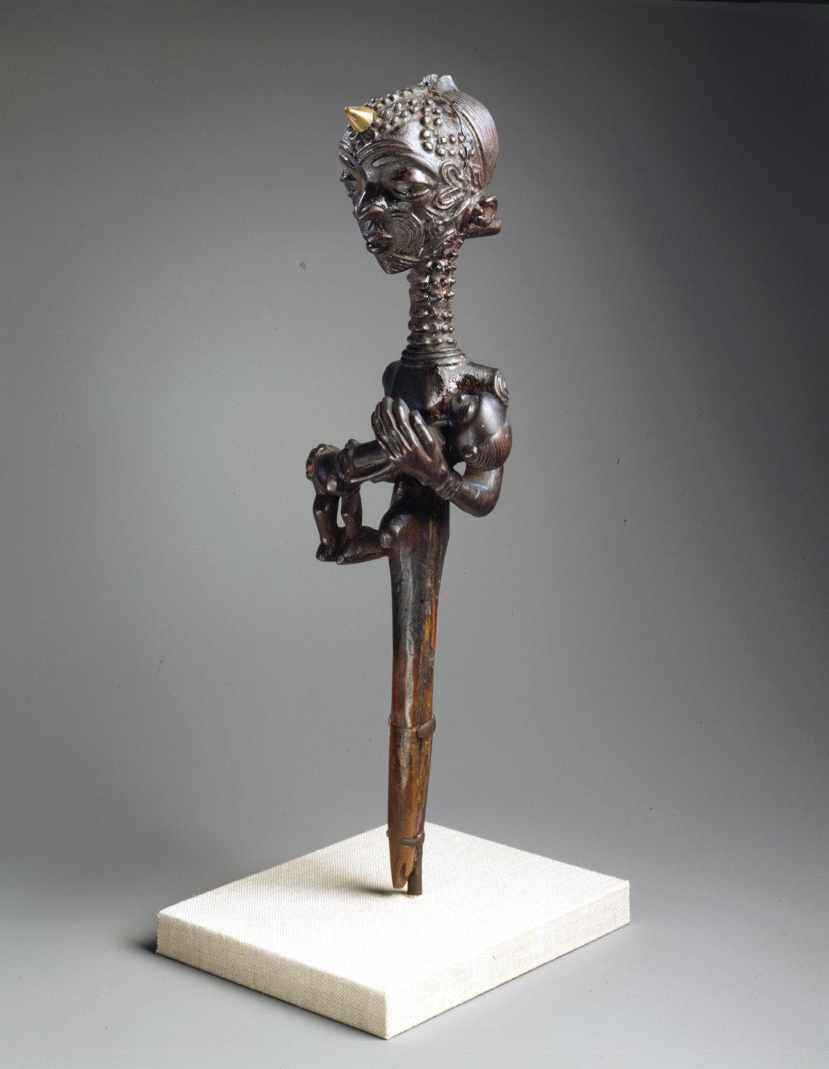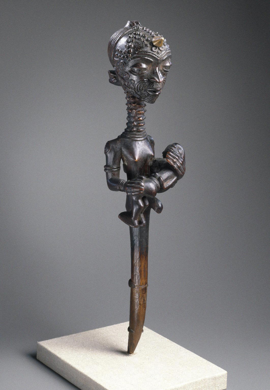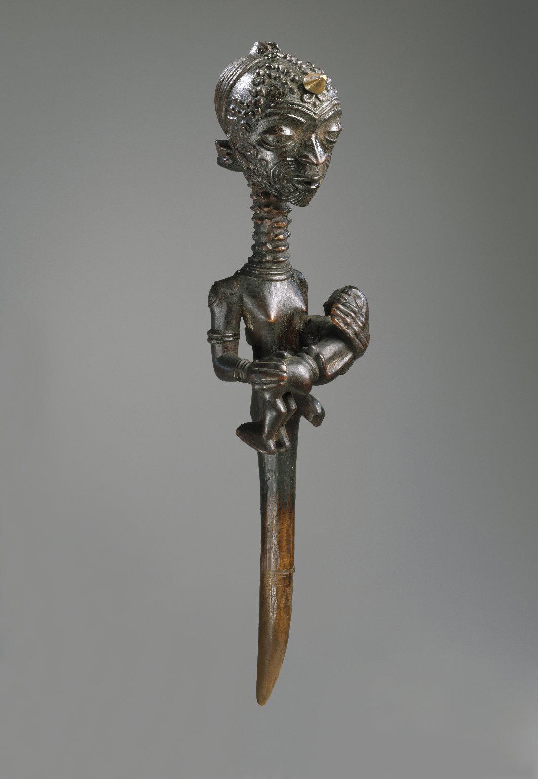 Lulua. Bwanga bwa Cibola (Figure of a Mother Holding a Child), 19th century. Wood, copper alloy, palm oil, tukula, organic materials, 14 x 3 3/8 x 3 1/2 in. (35.6 x 8.6 x 8.9 cm). Brooklyn Museum, Museum Collection Fund, 50.124. (Photo: Brooklyn Museum)