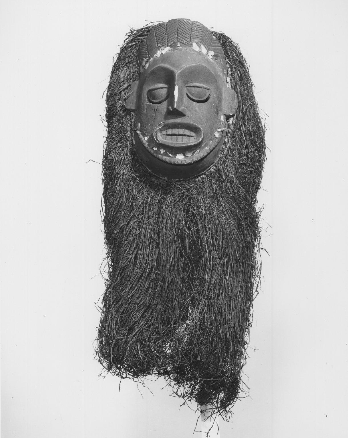 Ibibio. Ekpo Society Mask with Fringe Attachment, early 20th century. Wood, raffia or palm fiber, organic material, cloth fiber, 29 x 15 x 8 in. (73.7 x 38.1 x 20.4 cm) Mask: 11 3/4 x 8 x 8 in. (30.0 x 20.4 x 20.4 cm). Brooklyn Museum, Gift of Mr. and Mrs. J. Gordon Douglas III, 75.189.7. (Photo: Brooklyn Museum)