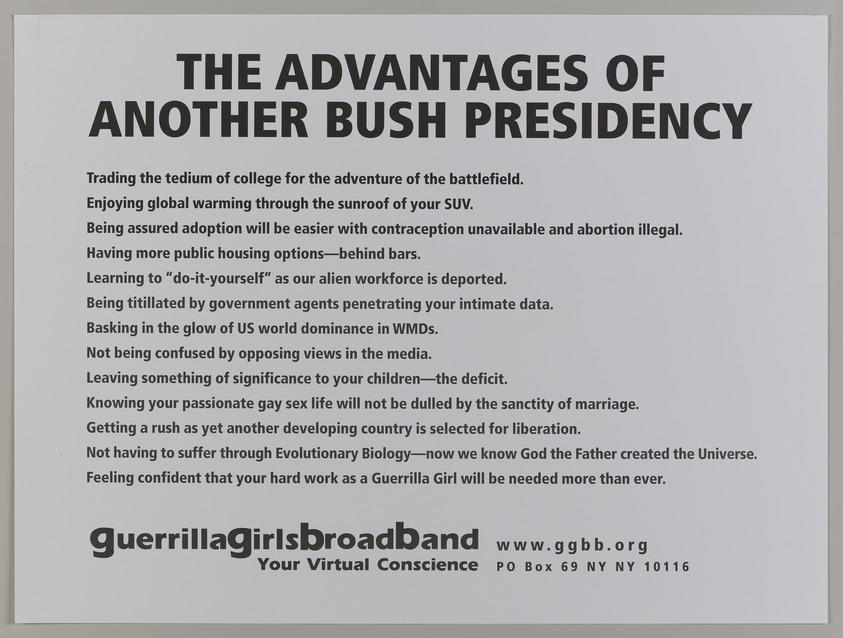 Guerrilla Girls BroadBand, Inc., (established United States, 2001). The Advantages of Another Bush Presidency, 2004. Offset lithograph, 18 × 24 in. (45.7 × 61 cm). Brooklyn Museum, Gift of Guerrilla Girls BroadBand, Inc., 2017.26.49. (Photo: Brooklyn Museum)