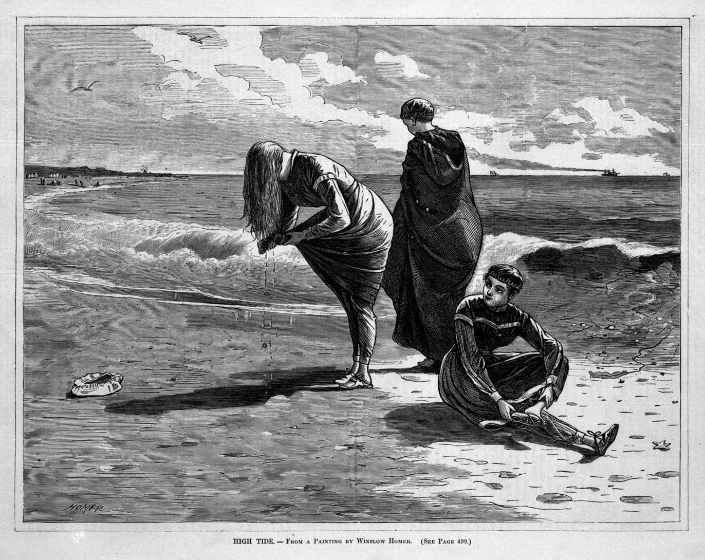 Winslow Homer (American, 1836–1910). High Tide, 1870. Wood engraving, Image: 9 1/4 x 12 1/8 in. (23.5 x 30.8 cm) Sheet: 10 7/8 x 14 5/8 in. (27.6 x 37.1 cm) Frame: 16 3/4 x 22 3/4 x 1 1/2 in. (42.5 x 57.8 x 3.8 cm). Brooklyn Museum, Gift of Harvey Isbitts, 1998.105.152. (Photo: Brooklyn Museum)