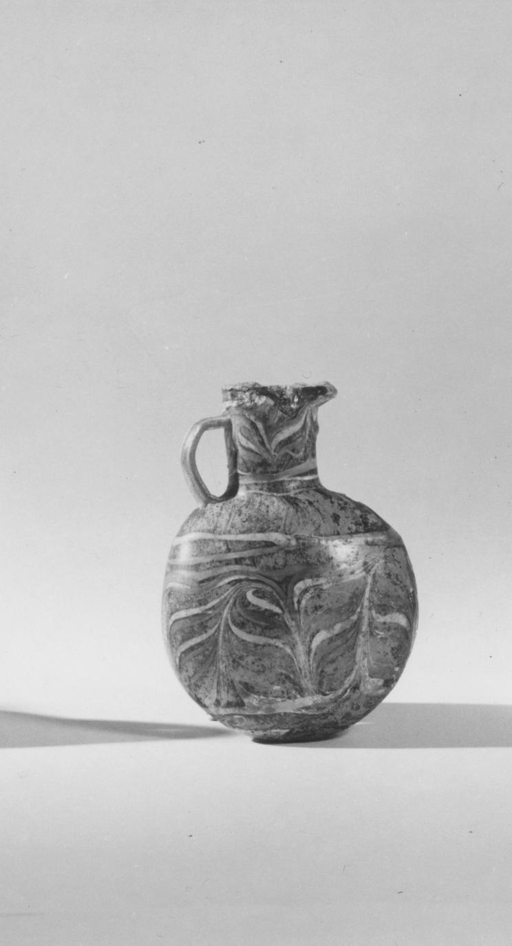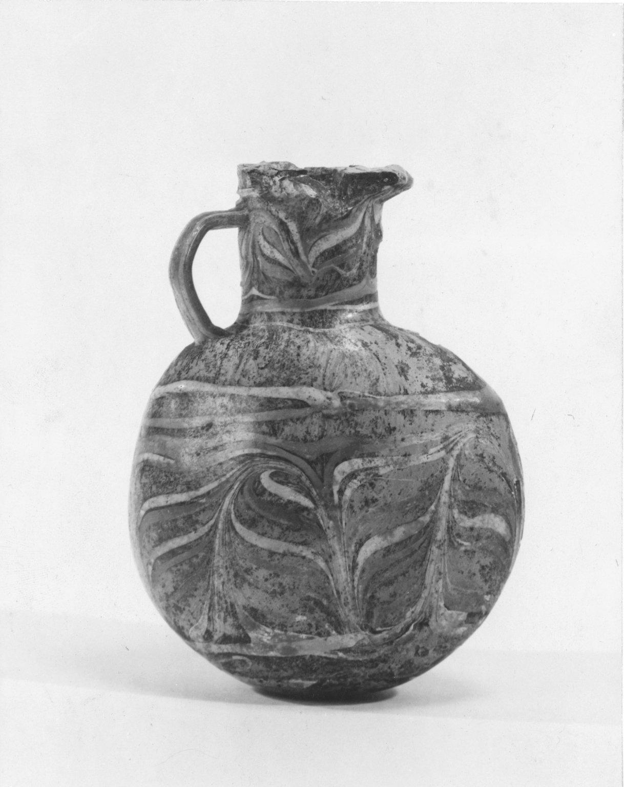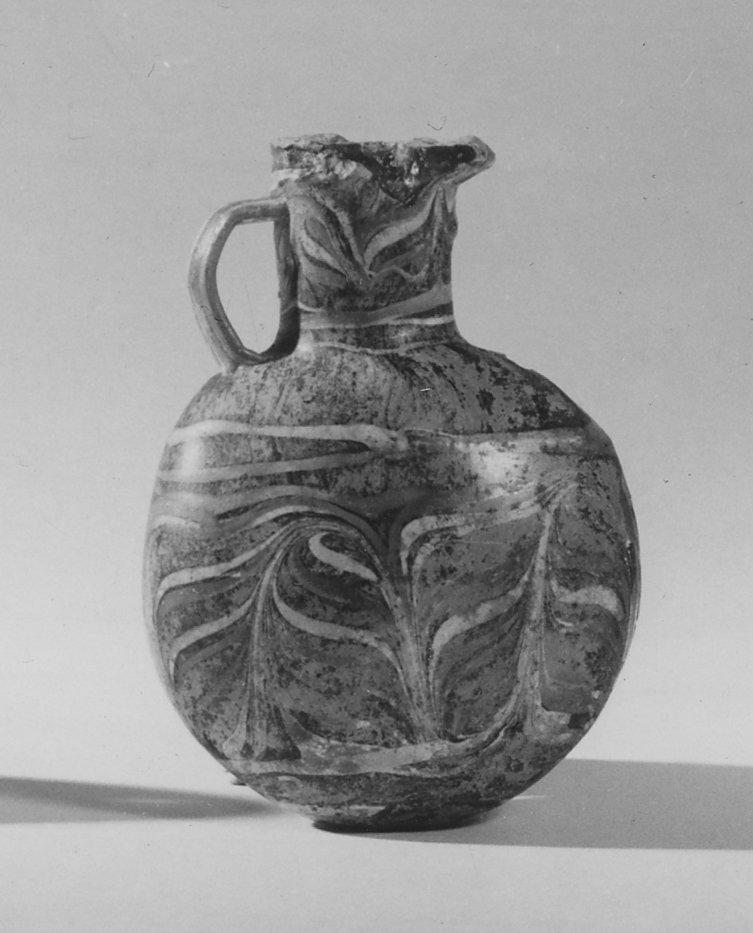 The Egyptians began manufacturing glass vessels during the Eighteenth Dynasty reign of Thutmose III (circa 1479–1425 B.C.E.). Early examples, valued for their rarity and beauty, were luxury items used to store precious oils and perfumes. Craftsmen produced striking effects by adding threads of colored glass to a vessel’s surface while it was still hot and then dragging a pointed object across the surface to produce festooned patterns. The artist who made the fish flask shown here indicated the animal’s scales by pressing blue powdered glass down into the interior.