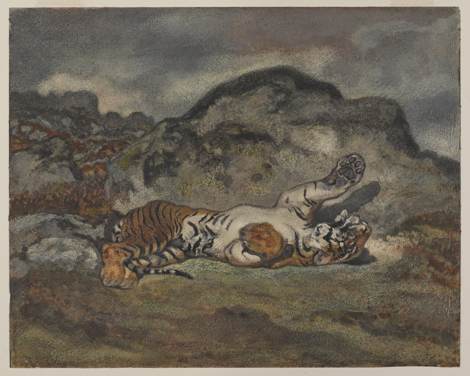 Antoine-Louis Barye (French, 1795–1875). Rolling Tiger (Tigre se roulant), ca. 1840. Watercolor and opaque watercolor on wove paper, sheet: 9 5/16 × 11 5/16 in. (23.7 × 28.7 cm). Brooklyn Museum, Purchased by Special Subscription, 10.96.