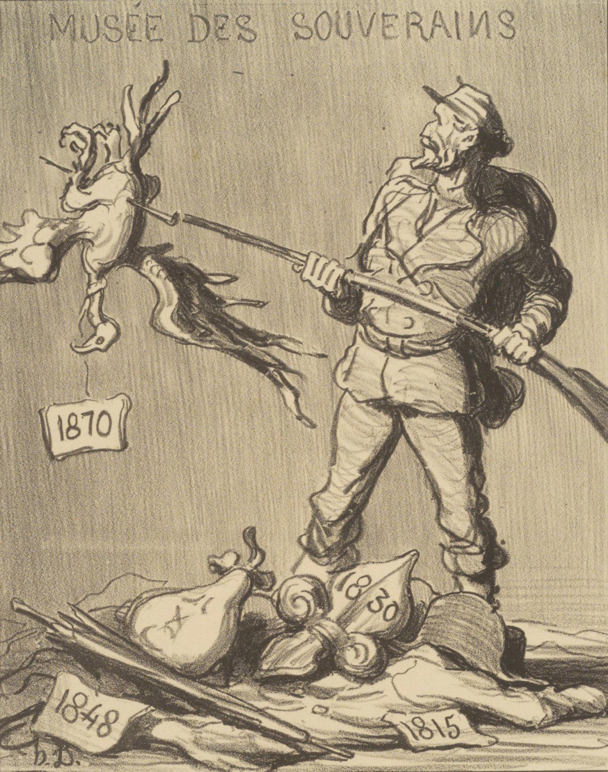 Top in stone: "MUSÉE DES SOUVERAINS" (n reversed); lower left in stone: "1870"; bottom left in stone: "1848" (stone number); lower center in stone: "1830"; bottom right in stone: "1815"