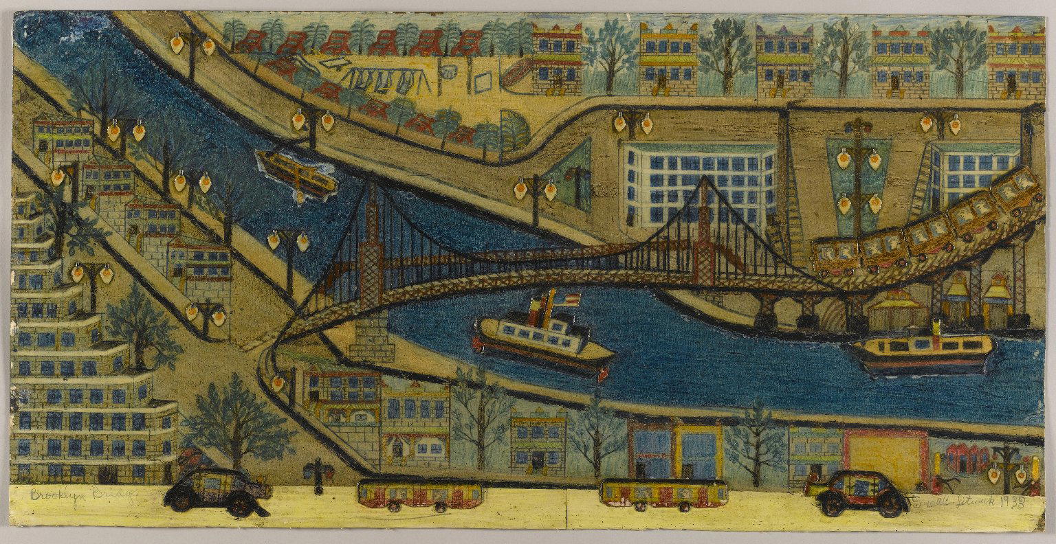 Israel Litwak (American, 1867–1960). Brooklyn Bridge, 1933. Pastel crayon and graphite on paperboard, coated with shellac, sheet: 19 x 28 in. (48.3 x 71.1 cm) frame: 20 5/8 × 33 × 2 in. (52.4 × 83.8 × 5.1 cm). Brooklyn Museum, Gift of the artist, 39.595. © Estate of Israel Litwak. (Photo: Brooklyn Museum)