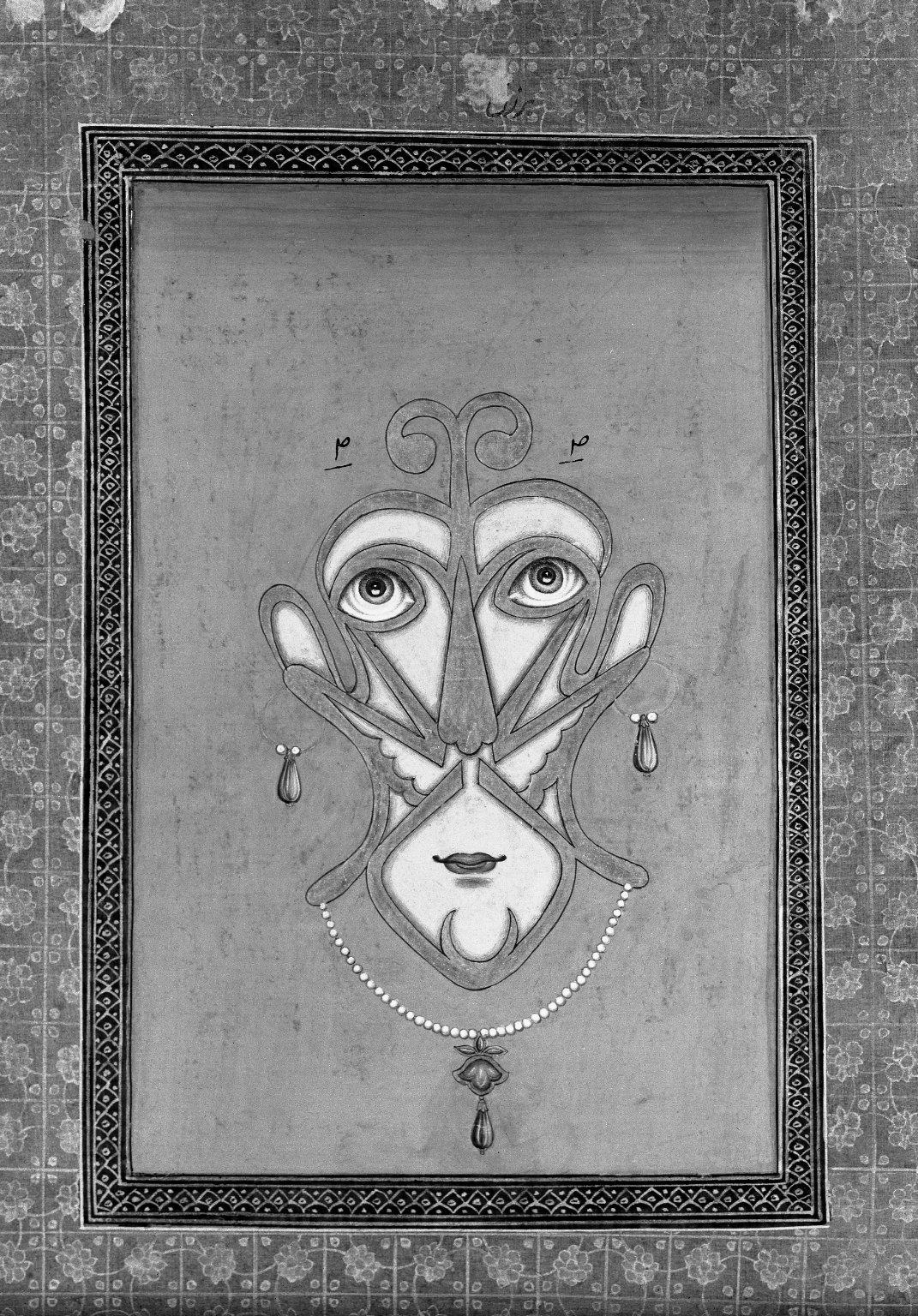 Indian. Calligraphic Face, 1875–1900. Opaque watercolor on paper, sheet: 19 11/16 x 11 7/8 in. (50.0 x 30.2 cm) image: 10 x 6 1/2 in. (25.4 x 16.5 cm). Brooklyn Museum, Gift of James S. Hays, 59.205.17. (Photo: Brooklyn Museum)