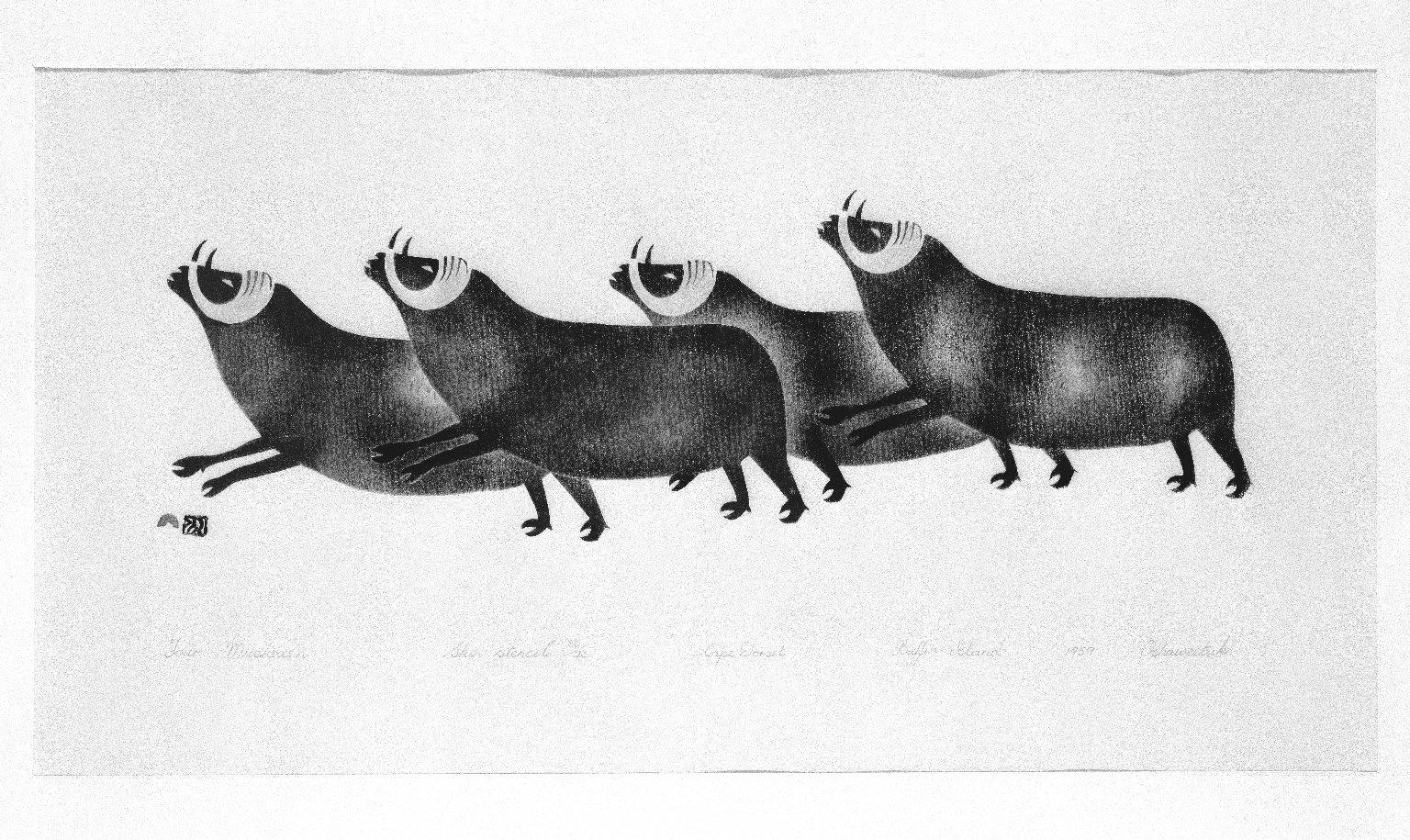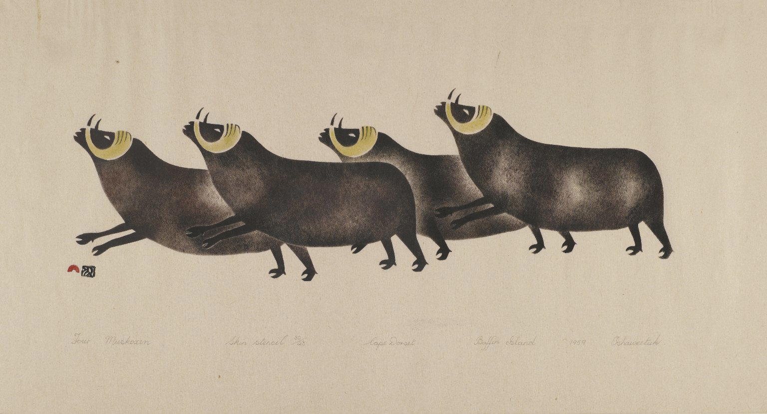 Osuitok Ipeelee (1922–2005); Inuit. Four Musk Oxen, 1959. Stencil (sealskin), paper, 11 15/16 x 21 15/16 in. (30.3 x 55.8 cm). Brooklyn Museum, Dick S. Ramsay Fund, 60.58.2. © Osheetok Ipeeli, courtesy of Dorset Fine Arts. (Photo: Brooklyn Museum)