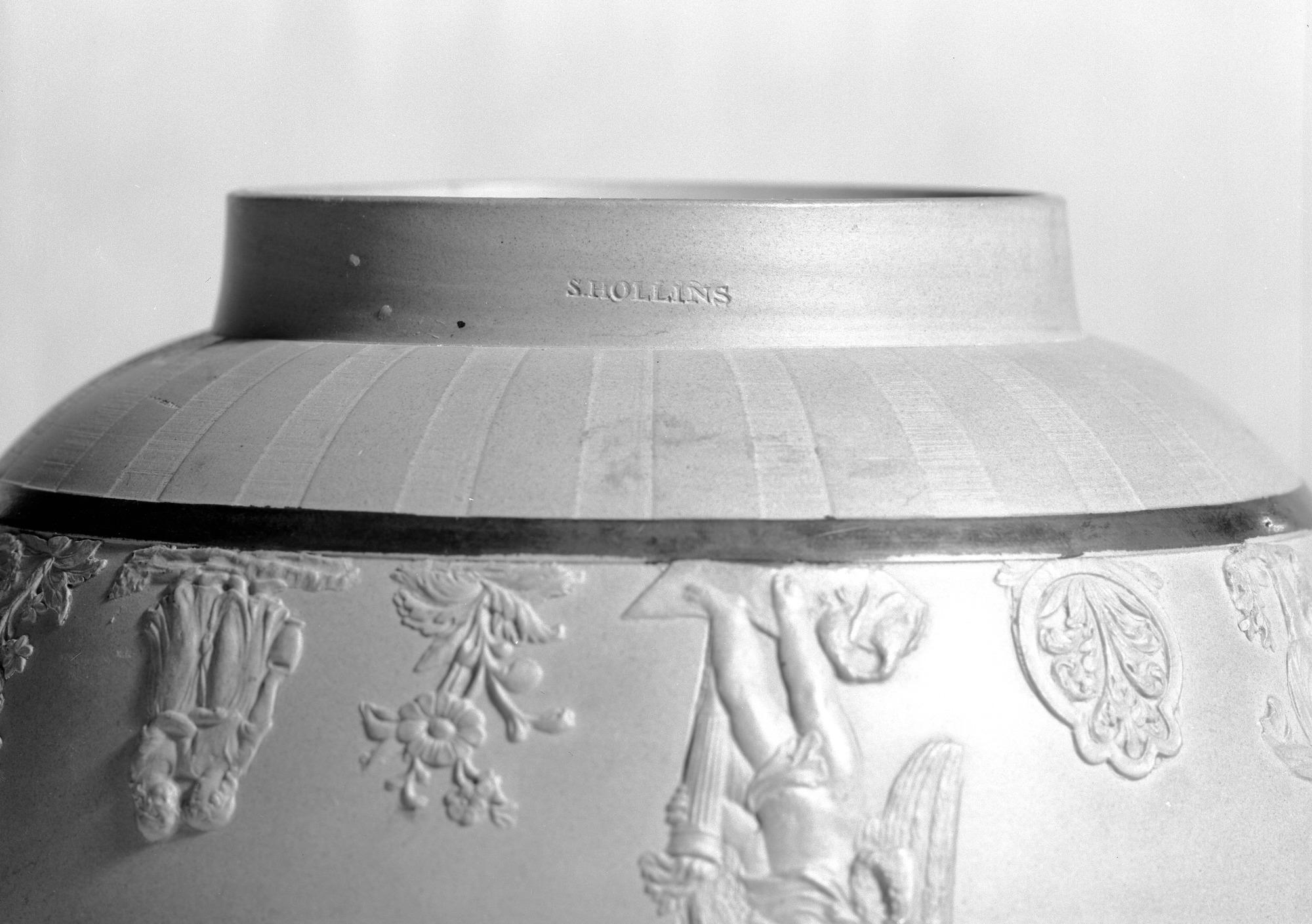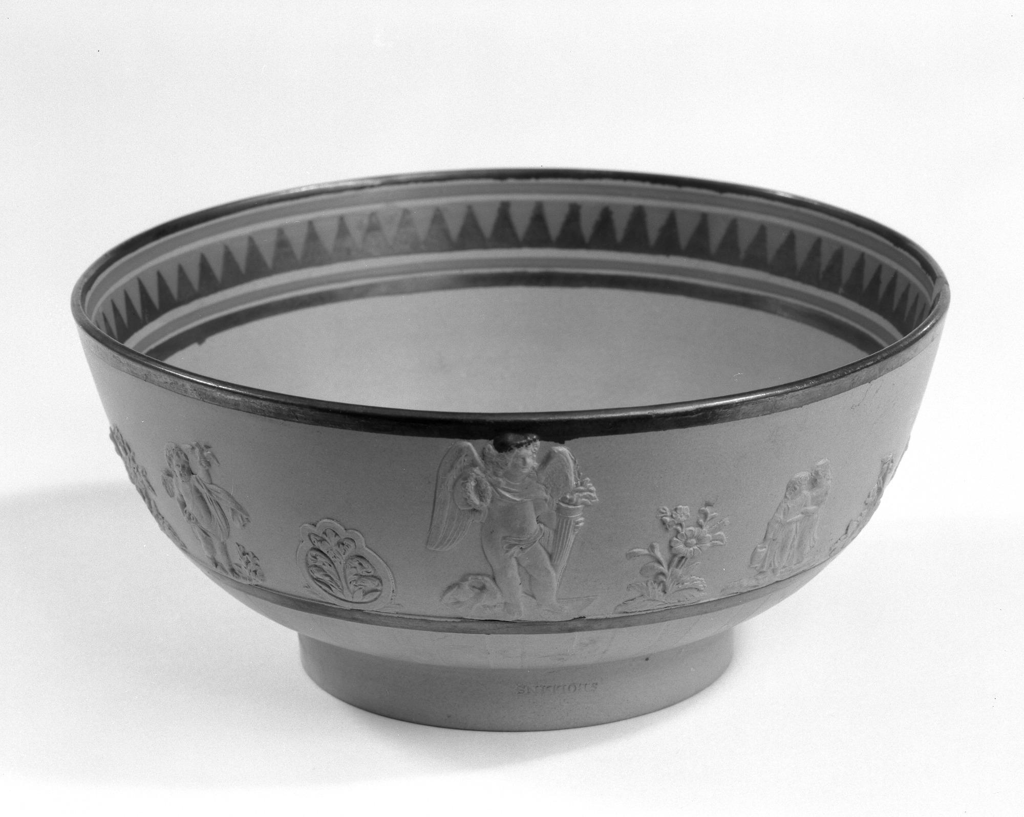 Samuel Hollins. Waste Bowl, ca. 1774–1790. Bisque molded earthenware, enamel, 2 7/8 × 6 1/4 in. (7.3 × 15.9 cm) base: 3 1/8 in. (7.9 cm). Brooklyn Museum, Gift of Mrs. George Backer, 73.16.4. (Photo: Brooklyn Museum)
