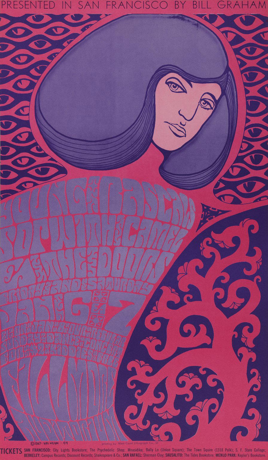Wes Wilson (American, 1937–2020). [Untitled] (The Young Rascals/Sopwith Camel/The Doors), 1967. Offset lithograph on paper, sheet: 23 11/16 x 13 7/8 in. (60.2 x 35.2 cm). Brooklyn Museum, Designated Purchase Fund, 73.39.46. © Wes Wilson. (Photo: Brooklyn Museum)