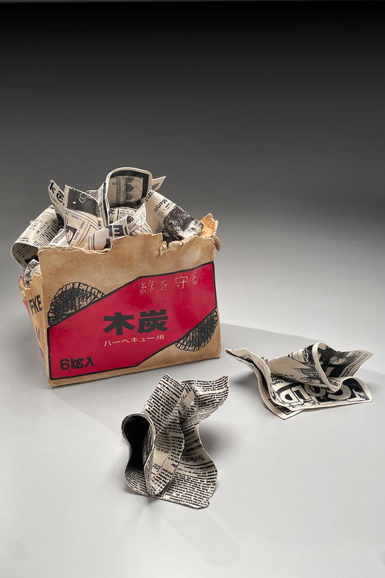 Sculpture of charcoal box filled with newspaper