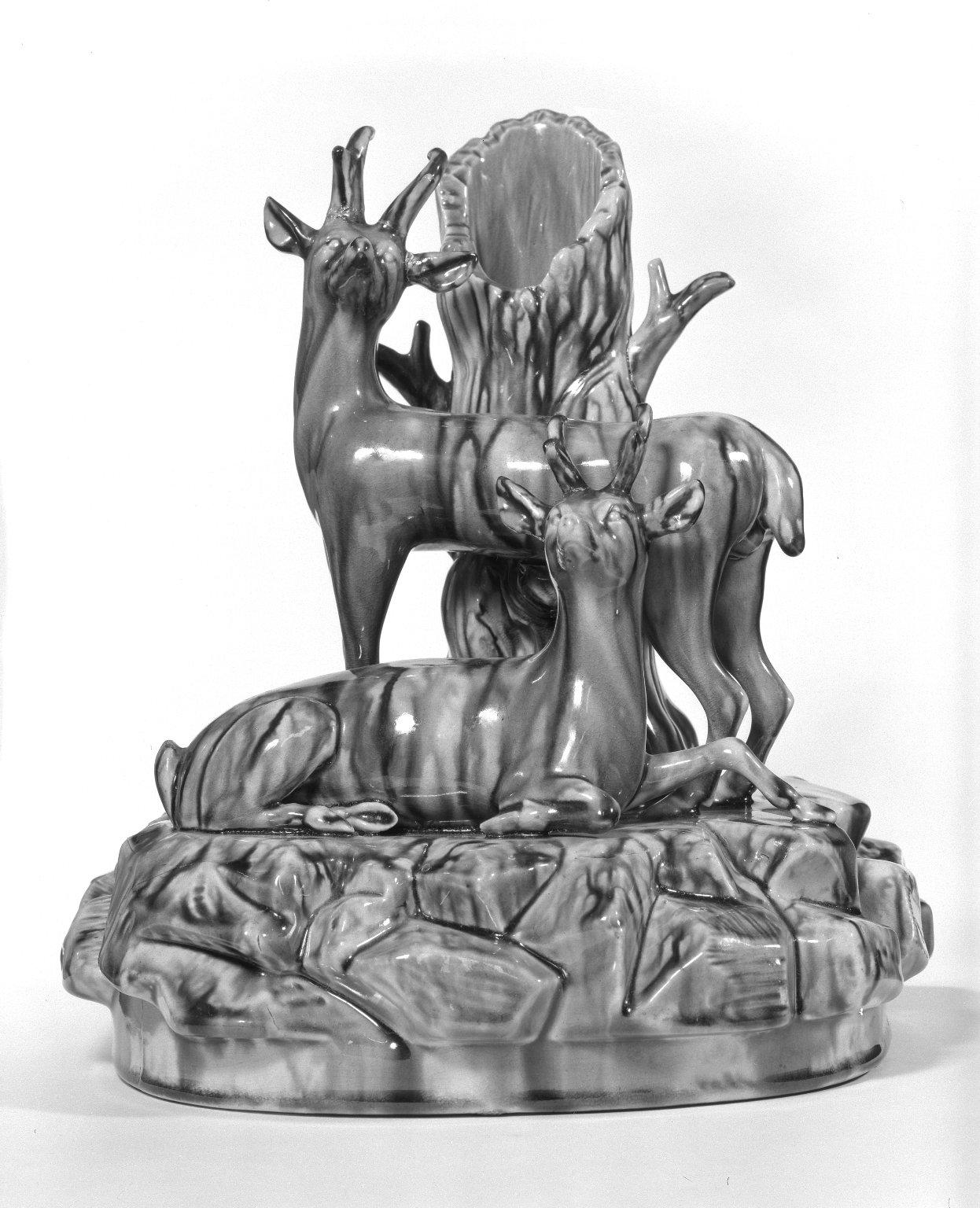 One Standing, One Seated Figure in Front of Hollow Tree Trunk