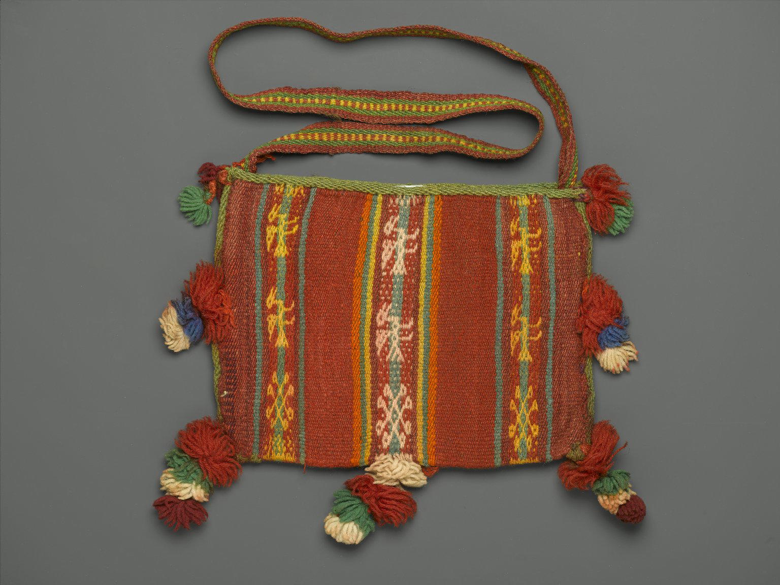 Aymara. Bag for Carrying Coca Leaves, 20th century. Camelid fiber?, wool?, 10 1/2 x 10 1/2 in. (26.7 x 26.7 cm) not including strap and pom-poms. Brooklyn Museum, Alfred T. White Fund, 30.1165.22. (Photo: Brooklyn Museum)