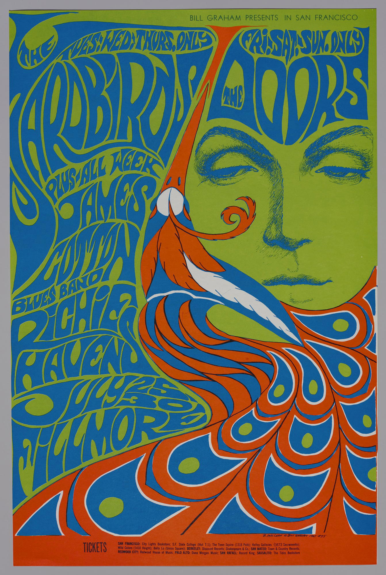 Bonnie MacLean (American, 1939–2020). [Untitled] (Yard Birds/The Doors/James Cotton/Richie Havens), 1967. Offset lithograph on paper, sheet: 21 1/4 x 14 in. (54 x 35.6 cm). Brooklyn Museum, Designated Purchase Fund, 73.39.76. © Bill Graham Archives, LLC, www.Wolfgangsvault.com. (Photo: Brooklyn Museum)