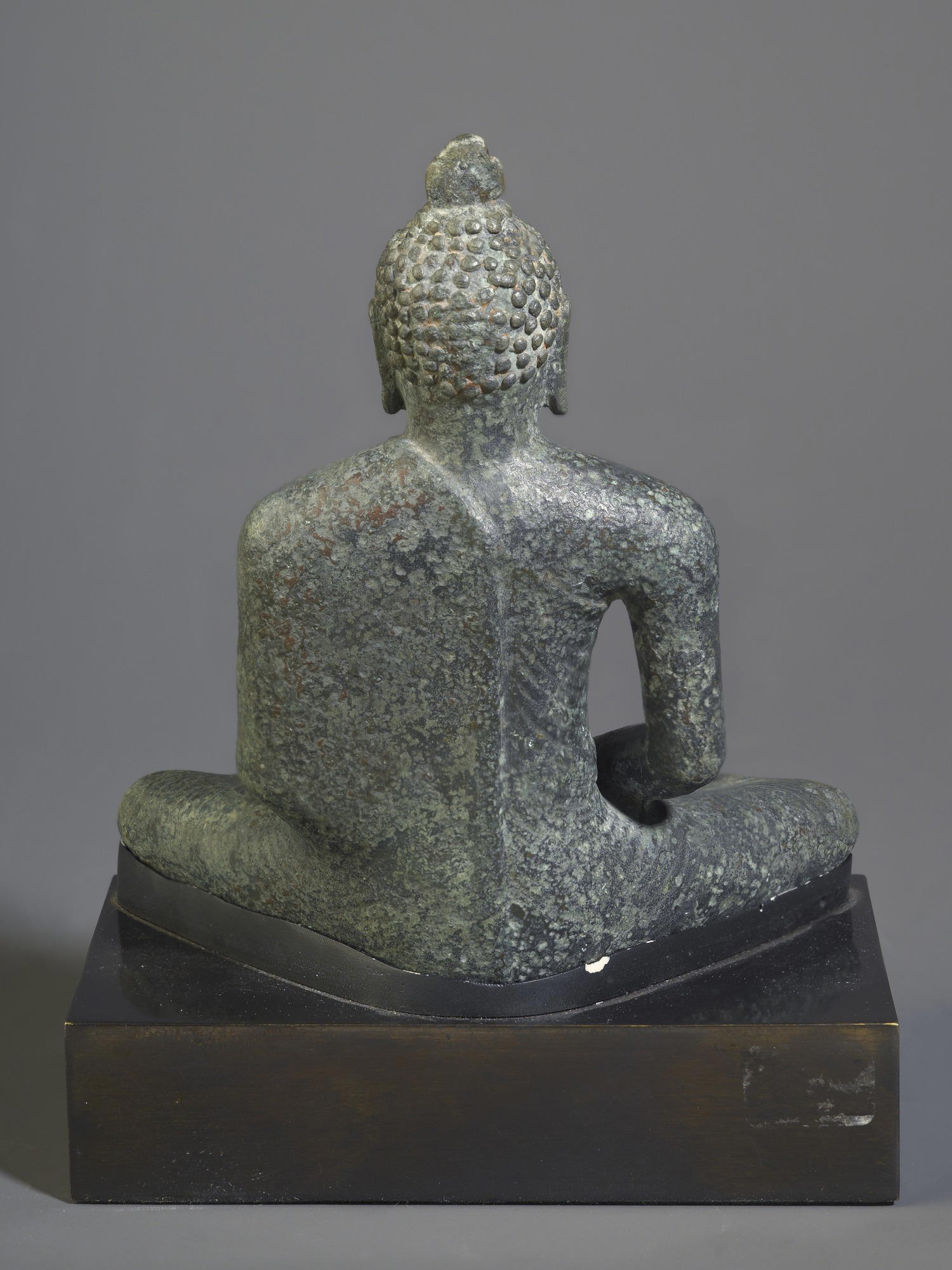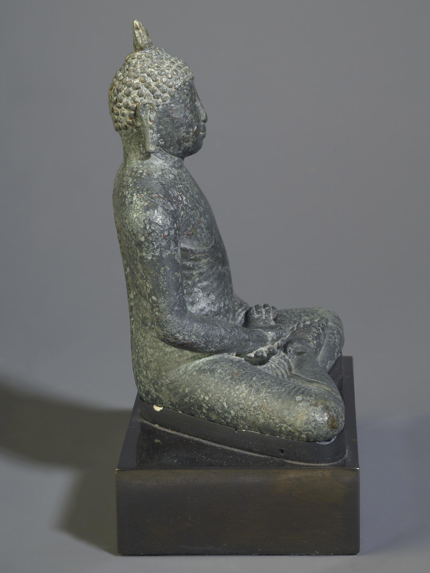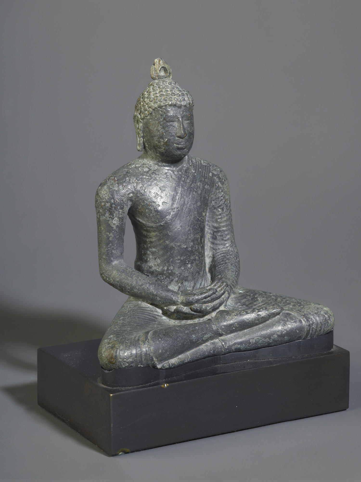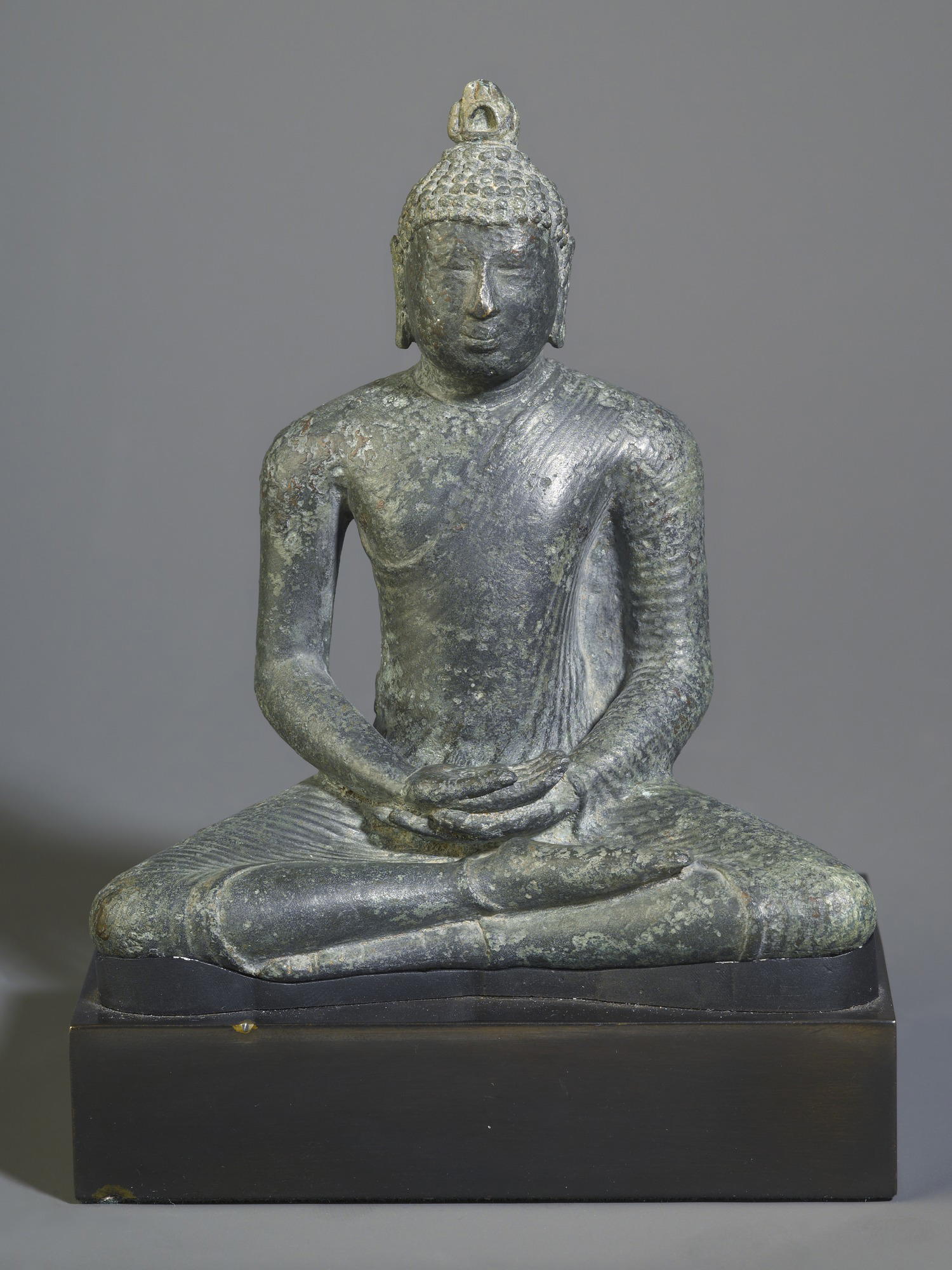 Seated Buddha, 7th–8th century. Bronze, 4 3/4 x 4 3/8 x 2 3/4 in. (12.1 x 11.1 x 7 cm). Brooklyn Museum, Gift of Georgia and Michael de Havenon, 86.183.5. (Photo: Brooklyn Museum)