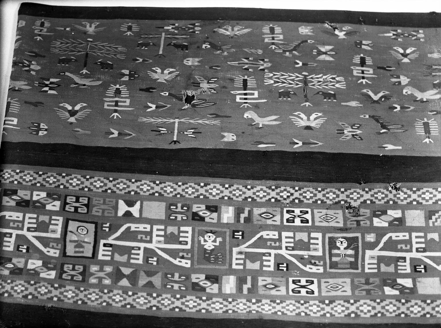 Camelid fiber and cotton with embroidered edge-stitching: Wool (camelid) weft-faced plain weave with cotton warps with bands of tapestry (single-locking junctures) and embroidered edge-stitching