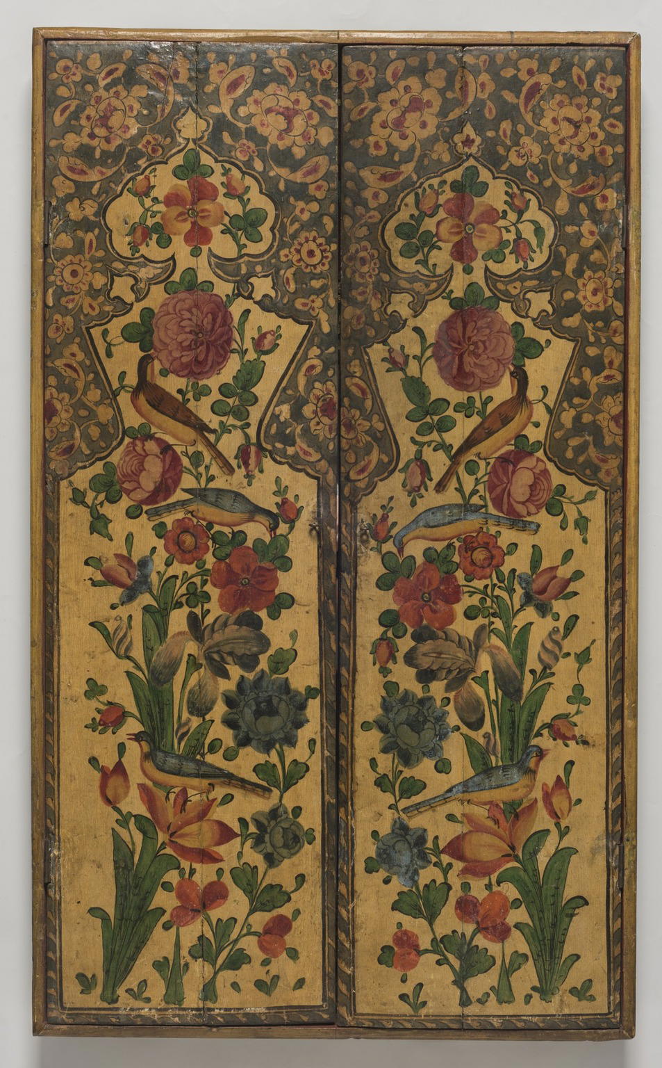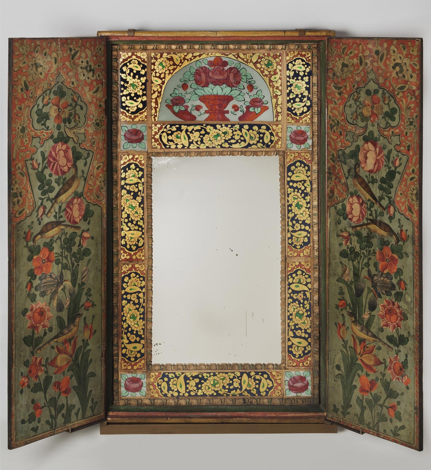 Mirror Case, early 19th century. Wood, glass, paint, metal leaf, paper, Open: 30 3/4 × 35 1/8 × 2 1/2 in. (78.1 × 89.2 × 6.4 cm) Closed: 30 3/4 × 18 × 2 1/2 in. (78.1 × 45.7 × 6.4 cm) Mirror: 16 1/2 x 10 in. (41.9 x 25.4 cm) Thickness of door: 3/8 in. (1 cm) mount (overall with object): 31 3/4 × 18 1/2 × 3 in. (80.6 × 47 × 7.6 cm). Brooklyn Museum, Anonymous gift, 72.161. (Photo: Brooklyn Museum)