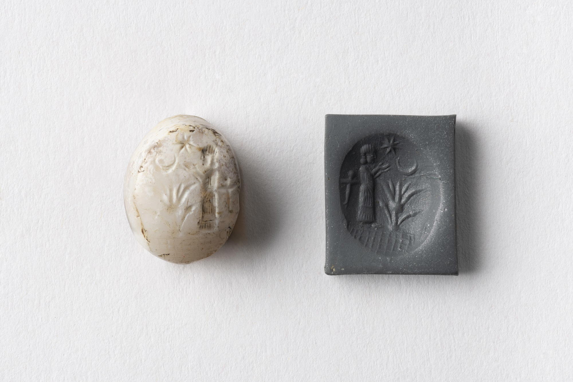 Ancient Near Eastern; Neo-Babylonian. Stamp Seal: Worshipper Before Plant, 6th–5th century B.C.E.. Stone, 7/8 x 7/16 x 9/16 in. (2.2 x 1.1 x 1.4 cm). Brooklyn Museum, Designated Purchase Fund, 75.55.1. (Photo: Brooklyn Museum)