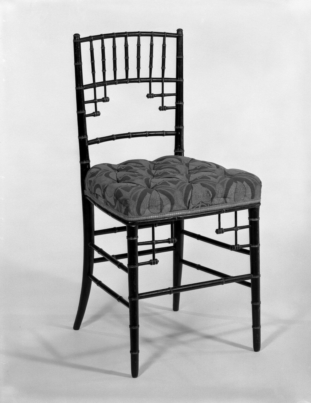 Side chair-one of a pair (Faux Bamboo/Aesthetic Movement style), ca. 1880, upholstery ca. 1900. Unidentified ebonized faux-bamboo wood, period upholstery, Overall height: 32 1/2 in. (82.5 cm) Height from floor to seat: 18 in. (45.7 cm) Width of seat: 16 1/2 in. (41.9 cm). Brooklyn Museum, Gift of Mrs. D. Chester Noyes, 75.110.1. (Photo: Brooklyn Museum)