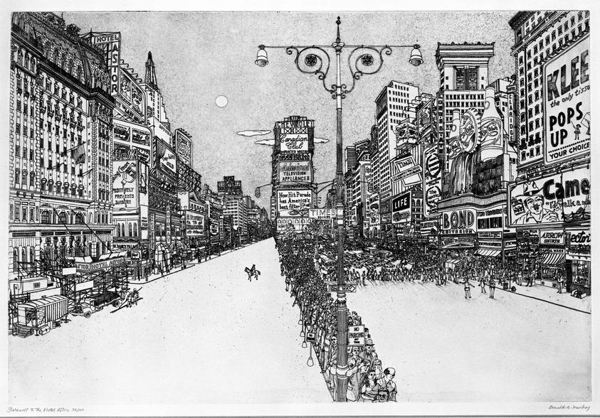 Donald A. Mackay (American, 1914–2005). Farewell to the Hotel Astor, 1971. Etching on paper, sheet: 19 3/4 x 24 3/8 in. (50.2 x 61.9 cm); plate: 13 5/8 x 10 1/4 in. (34.6 x 26.0 cm). Brooklyn Museum, Manufacturer's Hanover Trust Purchase Fund, 79.114.6. (Photo: Brooklyn Museum)