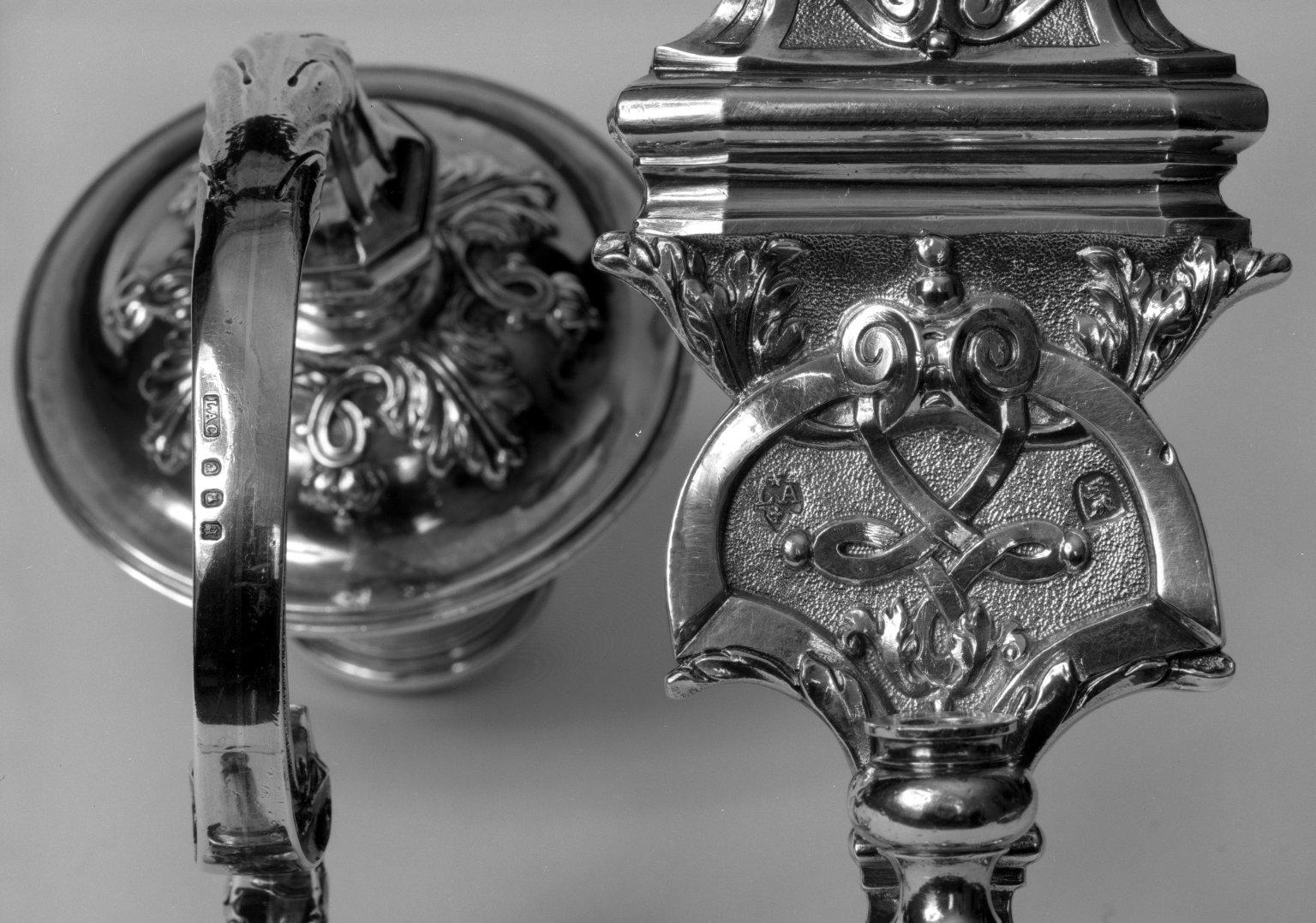On back: lion's head erased; marker's mark "LA" under star and over fleur de lis; on arms: Date letter "b", lion's head erased; maker's mark "LAC" and Britannia, Standard.