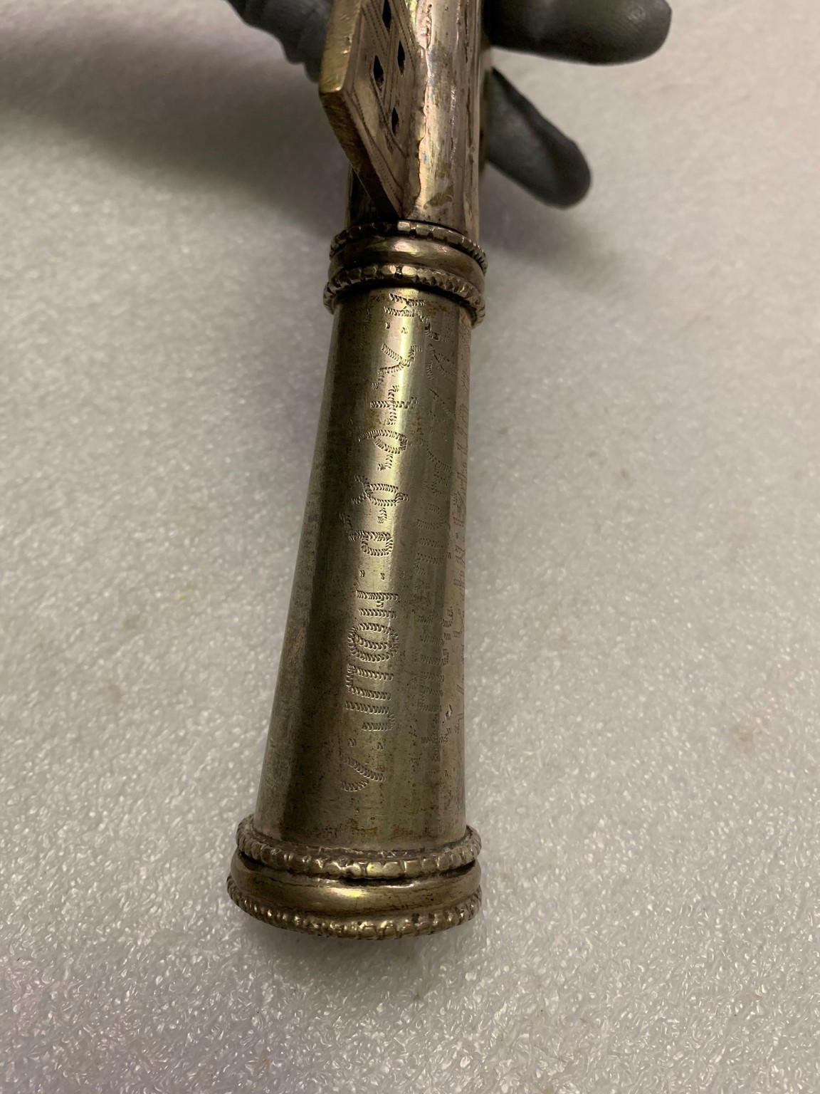 (in Ge'ez) This cross belongs to Empress Menen whose baptismal name is Walatta Giyorgis. She gave it to (the church of) Gethsemane Maryam on the 22 of Meskerem the Year of Grace 42 (EOC calendar 1942, Gregorian calendar 1949 or 1950). Translation done by Dr. Wolf Leslau, 1977.