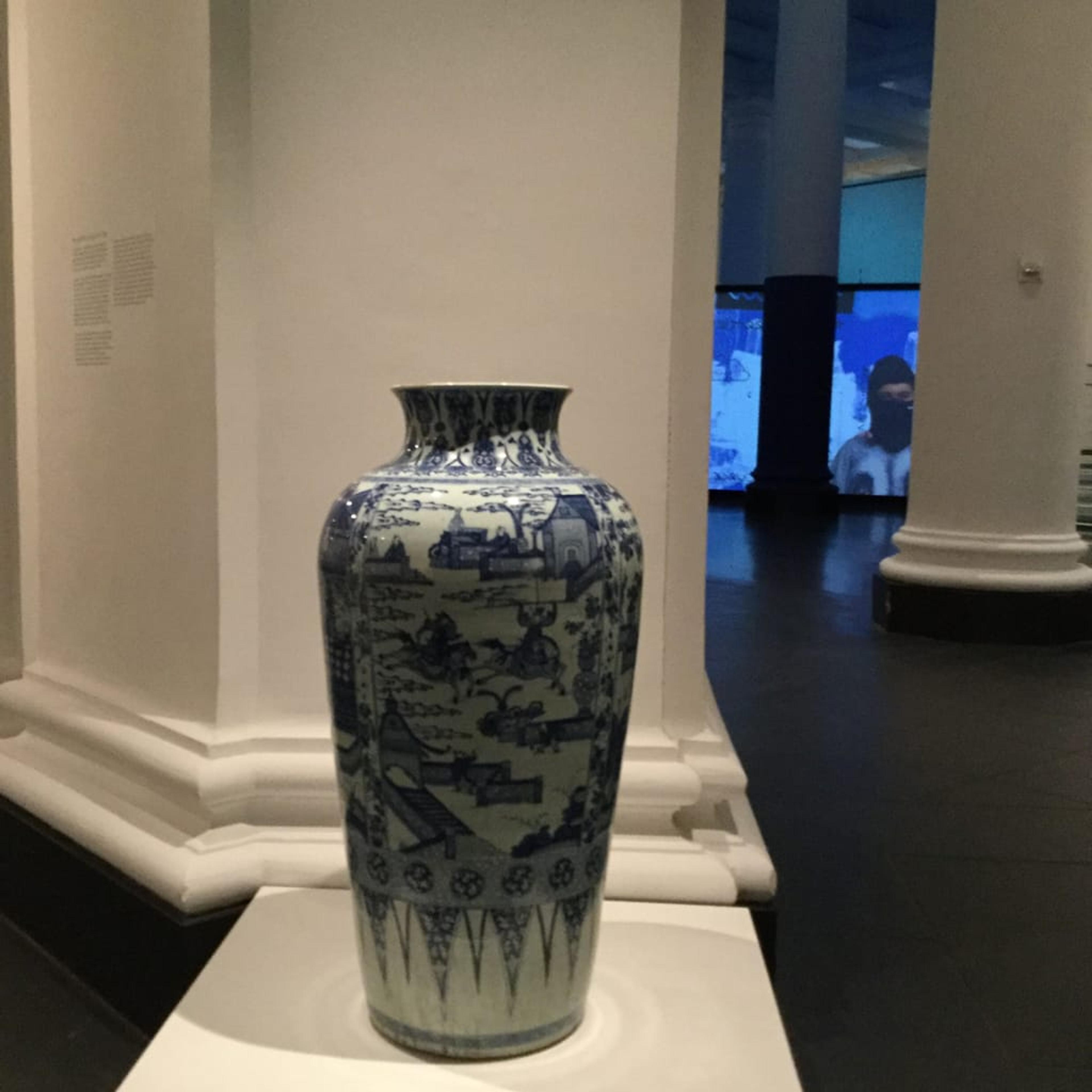 Blue is actually one of the rarer and harder-to-acquire pigments in the pre-modern world. The ways in which the color traveled and the lengths people went to in order to acquire it provide a basis for the cross-collection aspect of the exhibition.I'm a big fan of blue, and blue-and-white porcelain, so I quite like the idea. What do you think?I like the porcelain too. I think there's an interesting narrative created throughout the different porcelain works from different countries.Absolutely! It's a great way to look at the world and how interconnected humanity, and our interests, can be.Very true. Are all of the pieces part of the permanent collection?For the most part, yes. There are a few loans, such as the video installation, but the core of the exhibition is from the museum's permanent collection. The concept of the exhibition is to create an introductory experience that gives visitors a sense of what our collection holds.It also allows us to showcase some works from the Asian collection while those galleries are closed for reinstallation.What is this?