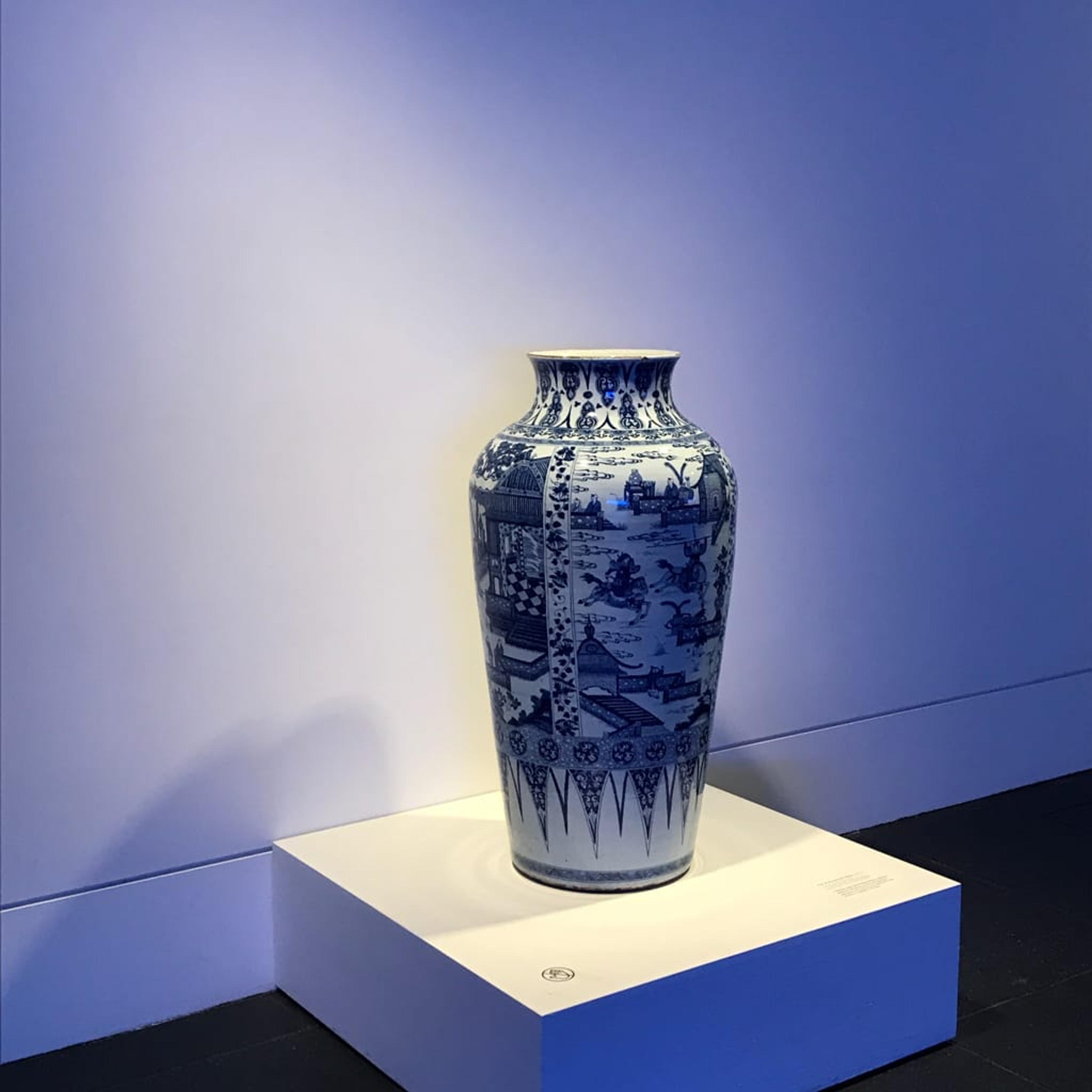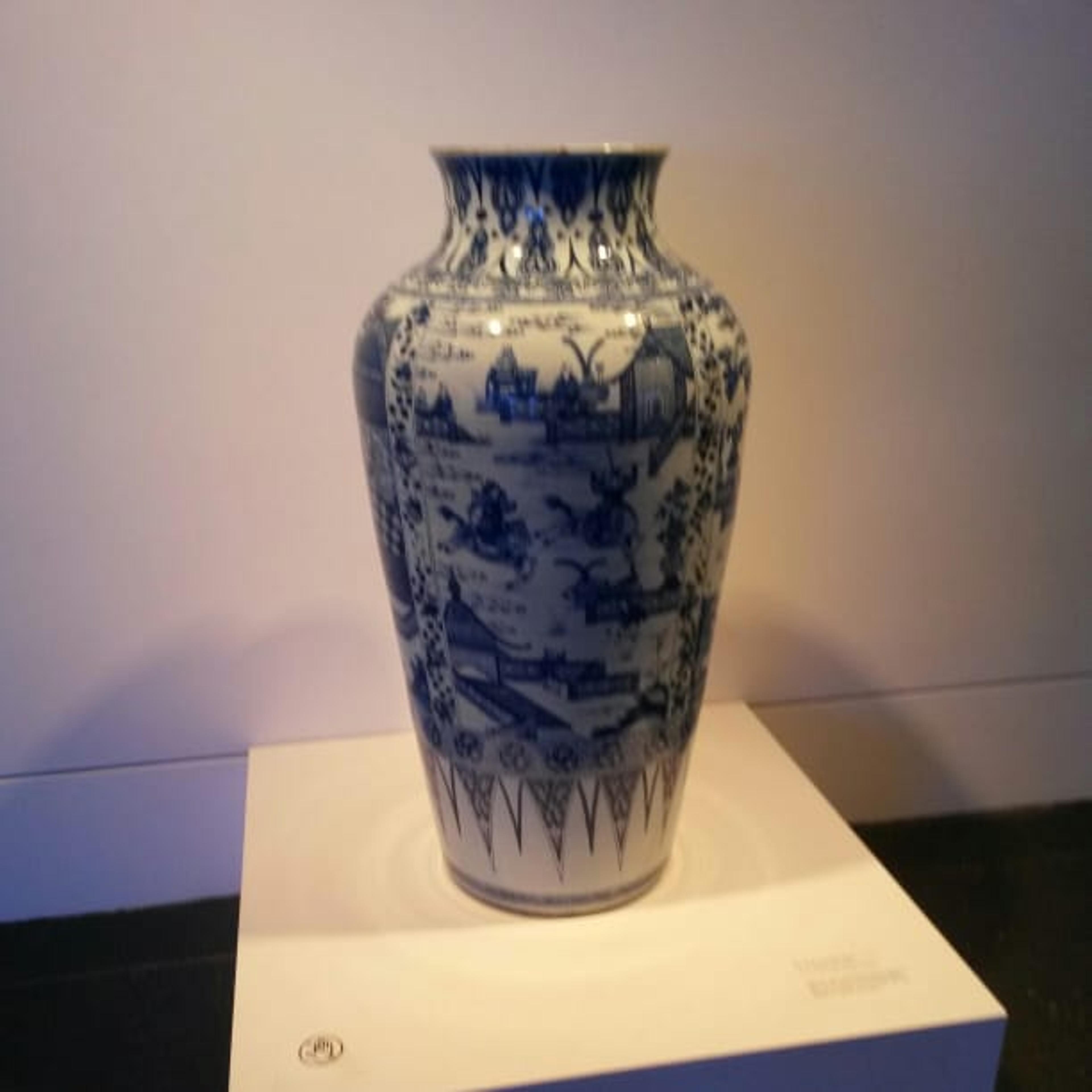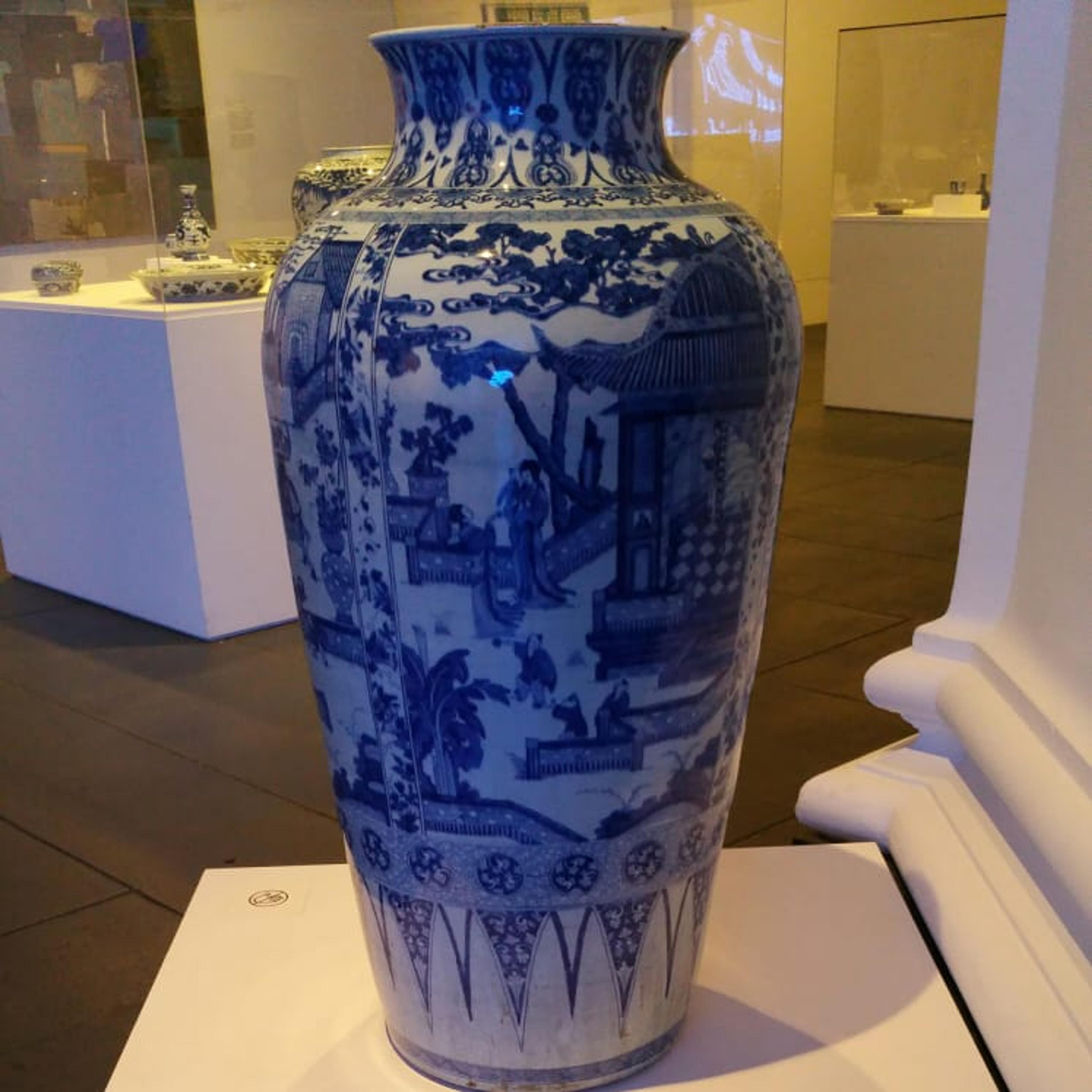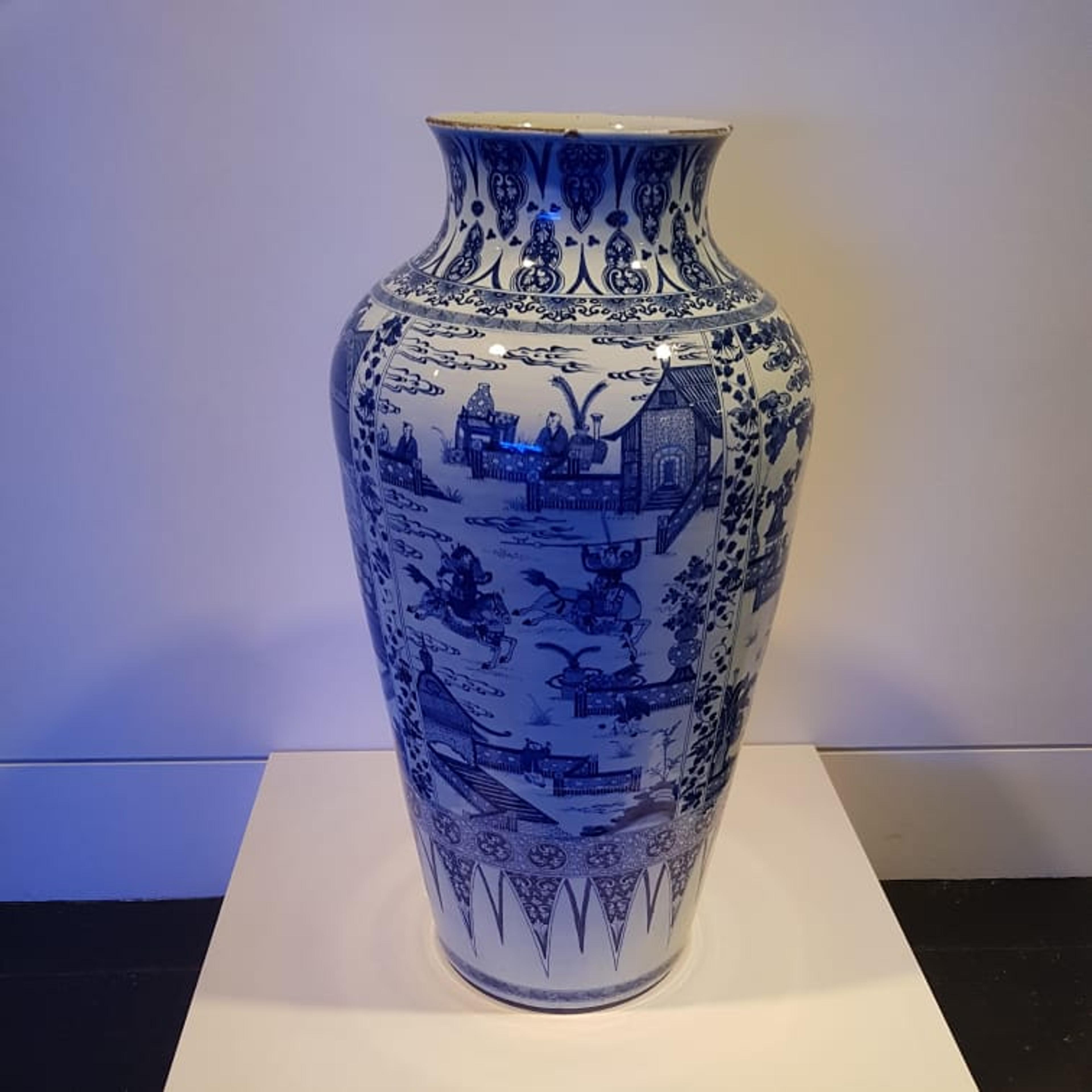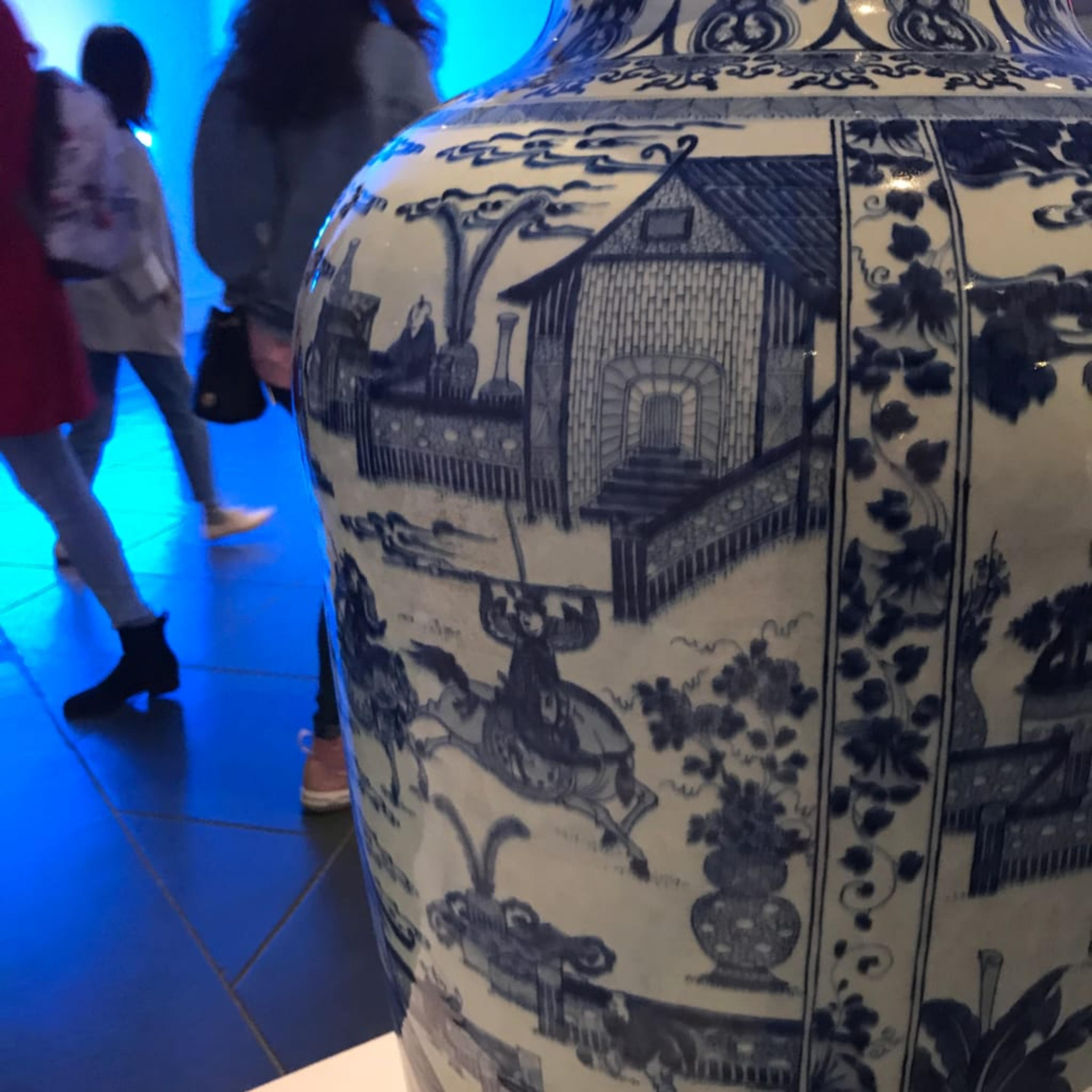 The short answer is: through a lot of trade. This monumental vase represents the popularity and mastery of blue and white porcelain during the Kangxi period in China, around 1662 to 1722.Blue and white porcelain production first started gaining popularity in China in the 14th century, under the Mongols. By the Ming dynasty, these blue and white wares were being exported to Europe.They then grew in popularity in Europe, and by the Qing Dynasty (1644-1911) there was a boom in export of blue and white porcelain to Europe.With high demand, businesses in Europe and the United States started to make pieces in imitation of these Chinese imports.These imitation wares include Delft ware, earthenware covered with thick tin-based glaze to imitate Asian porcelain, and developed in Delft in the Netherlands.We think this looks like the underworld. Is it?