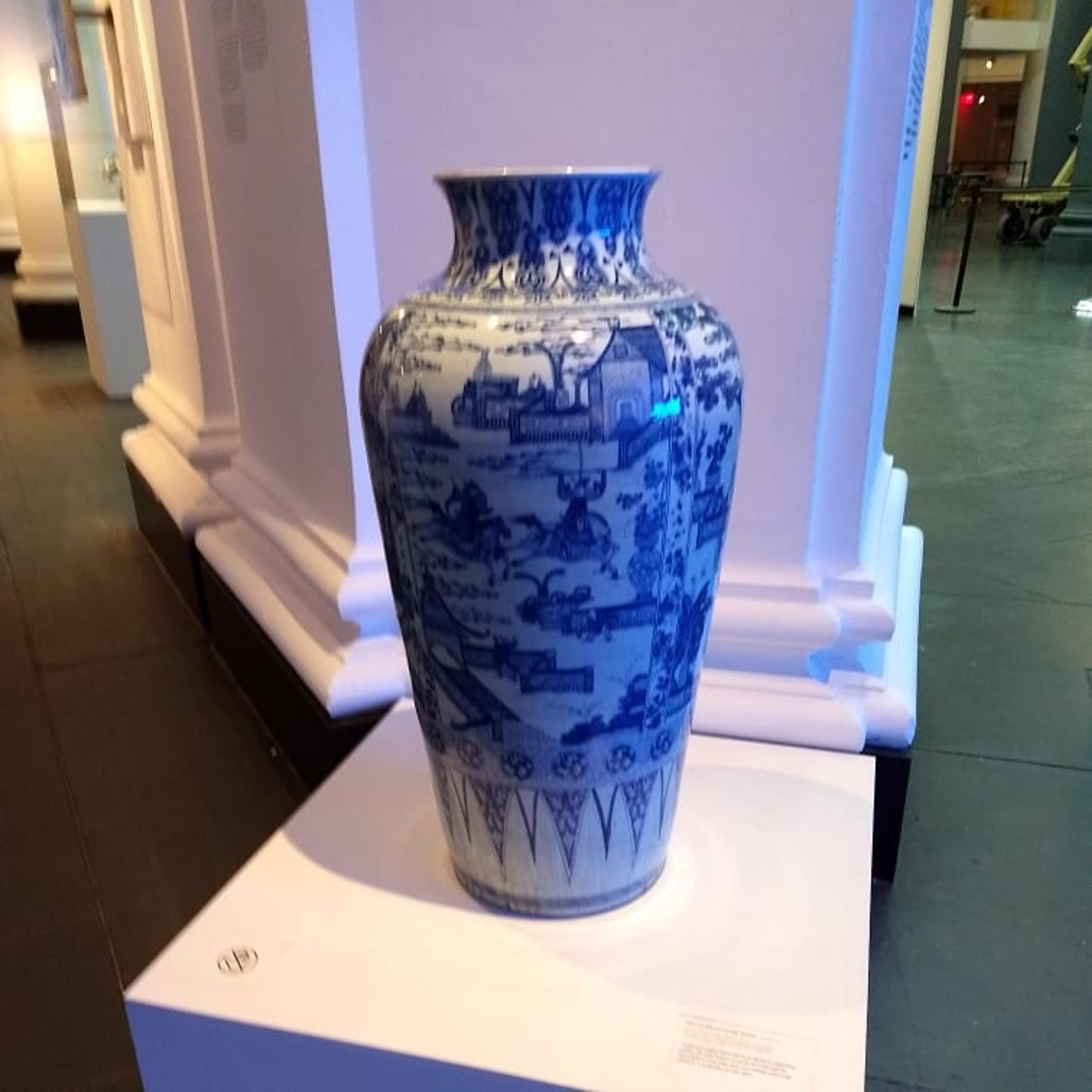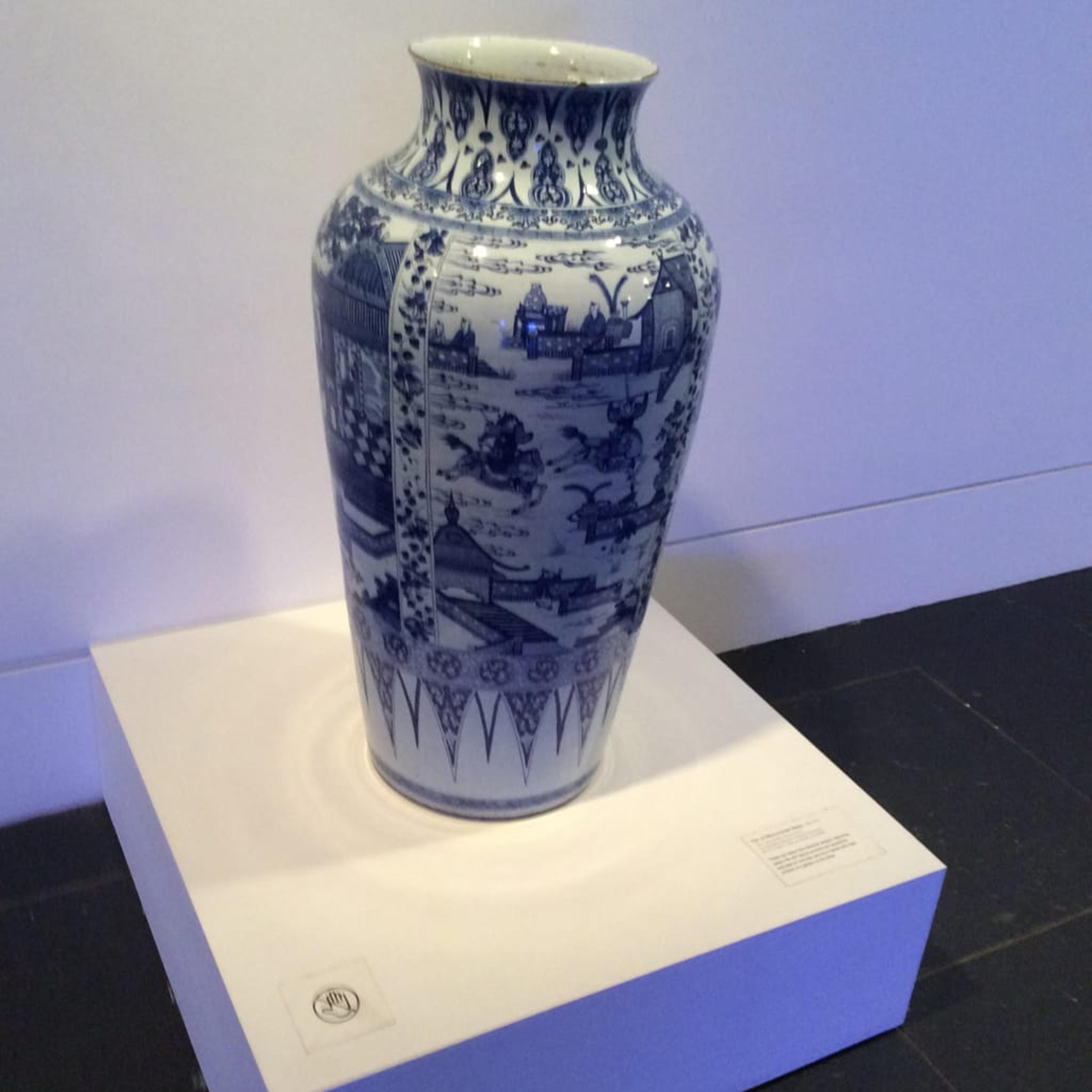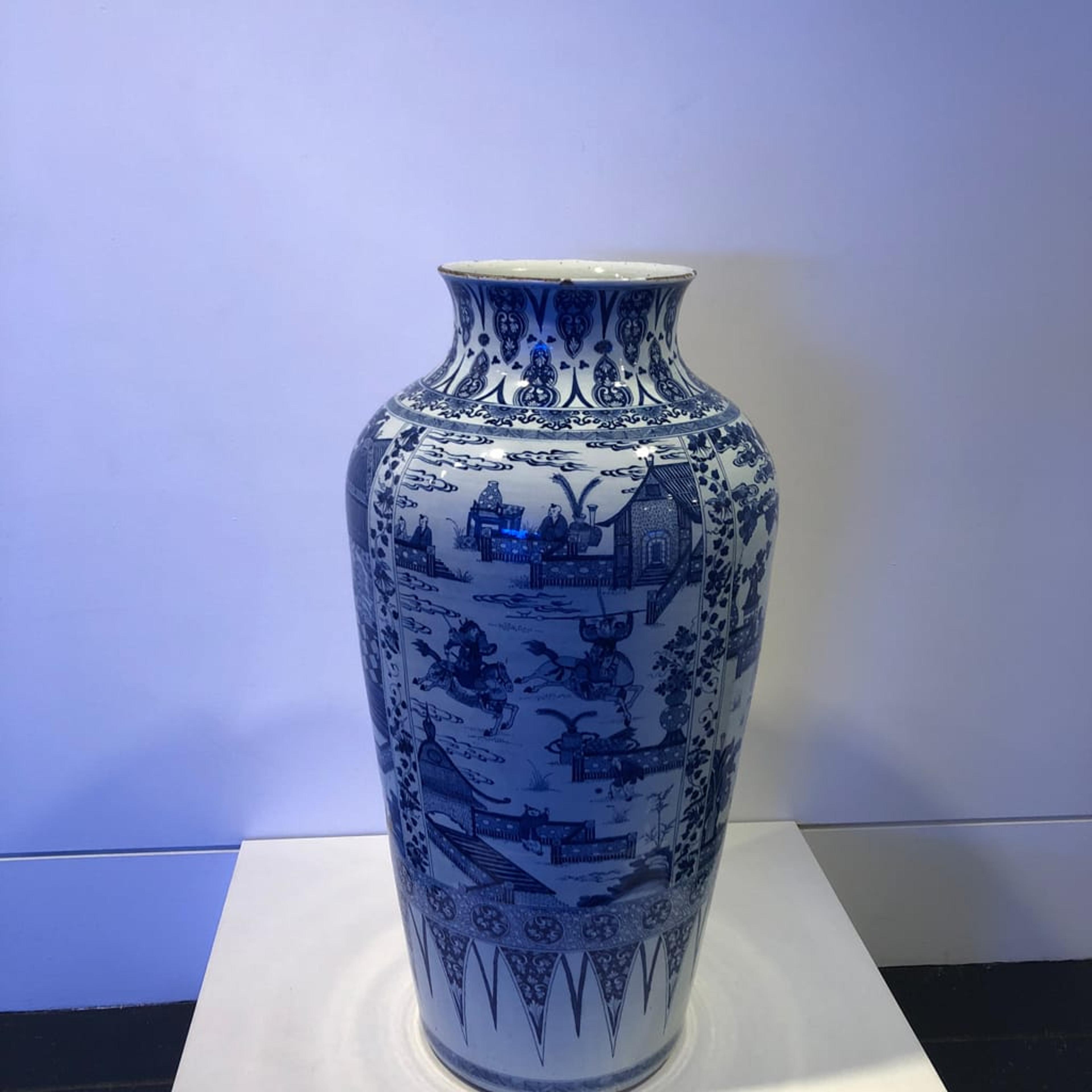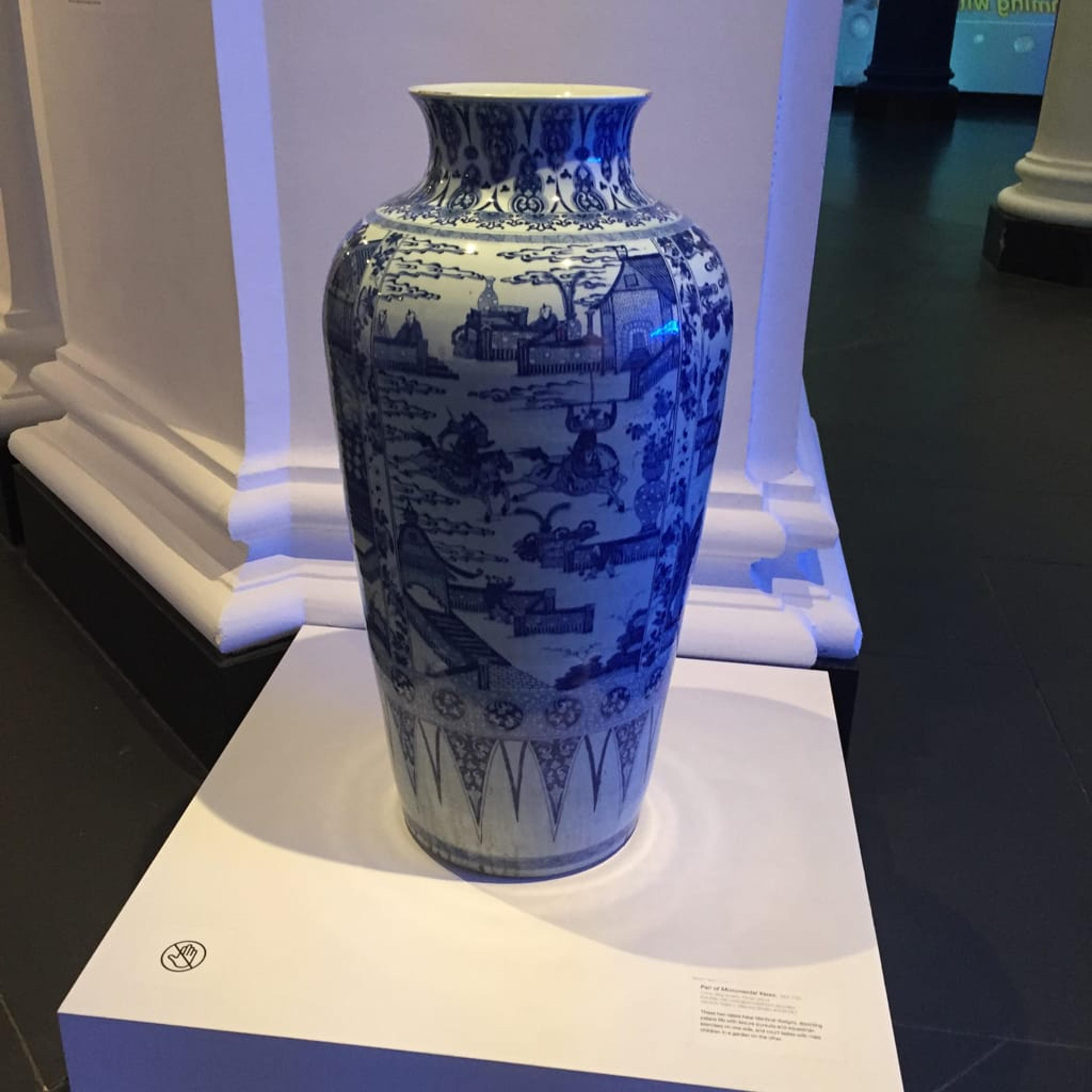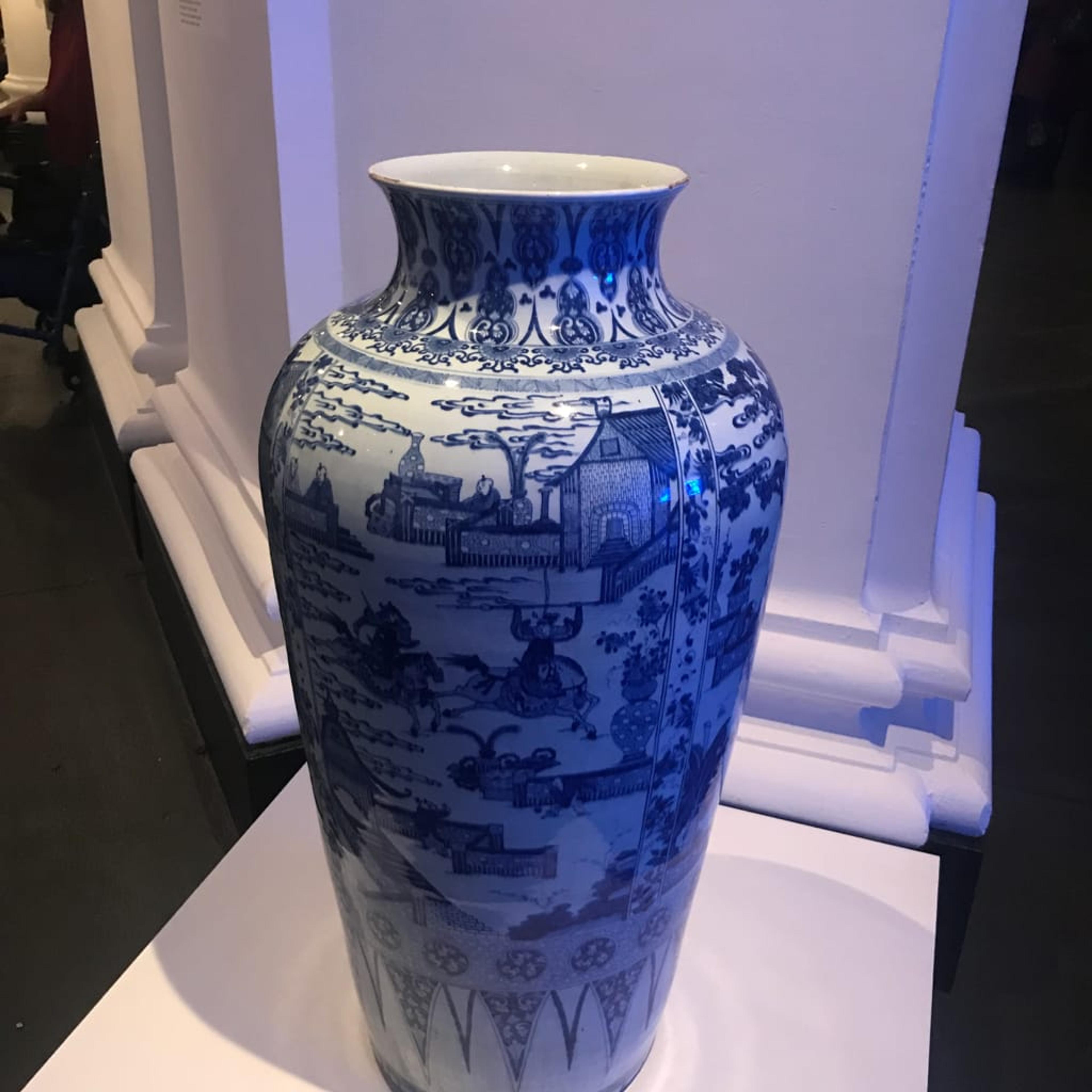 The short answer is: through a lot of trade. This monumental vase represents the popularity and mastery of blue and white porcelain during the Kangxi period in China, around 1662 to 1722.Blue and white porcelain production first started gaining popularity in China in the 14th century, under the Mongols. By the Ming dynasty, these blue and white wares were being exported to Europe.They then grew in popularity in Europe, and by the Qing Dynasty (1644-1911) there was a boom in export of blue and white porcelain to Europe.With high demand, businesses in Europe and the United States started to make pieces in imitation of these Chinese imports.These imitation wares include Delft ware, earthenware covered with thick tin-based glaze to imitate Asian porcelain, and developed in Delft in the Netherlands.We think this looks like the underworld. Is it?