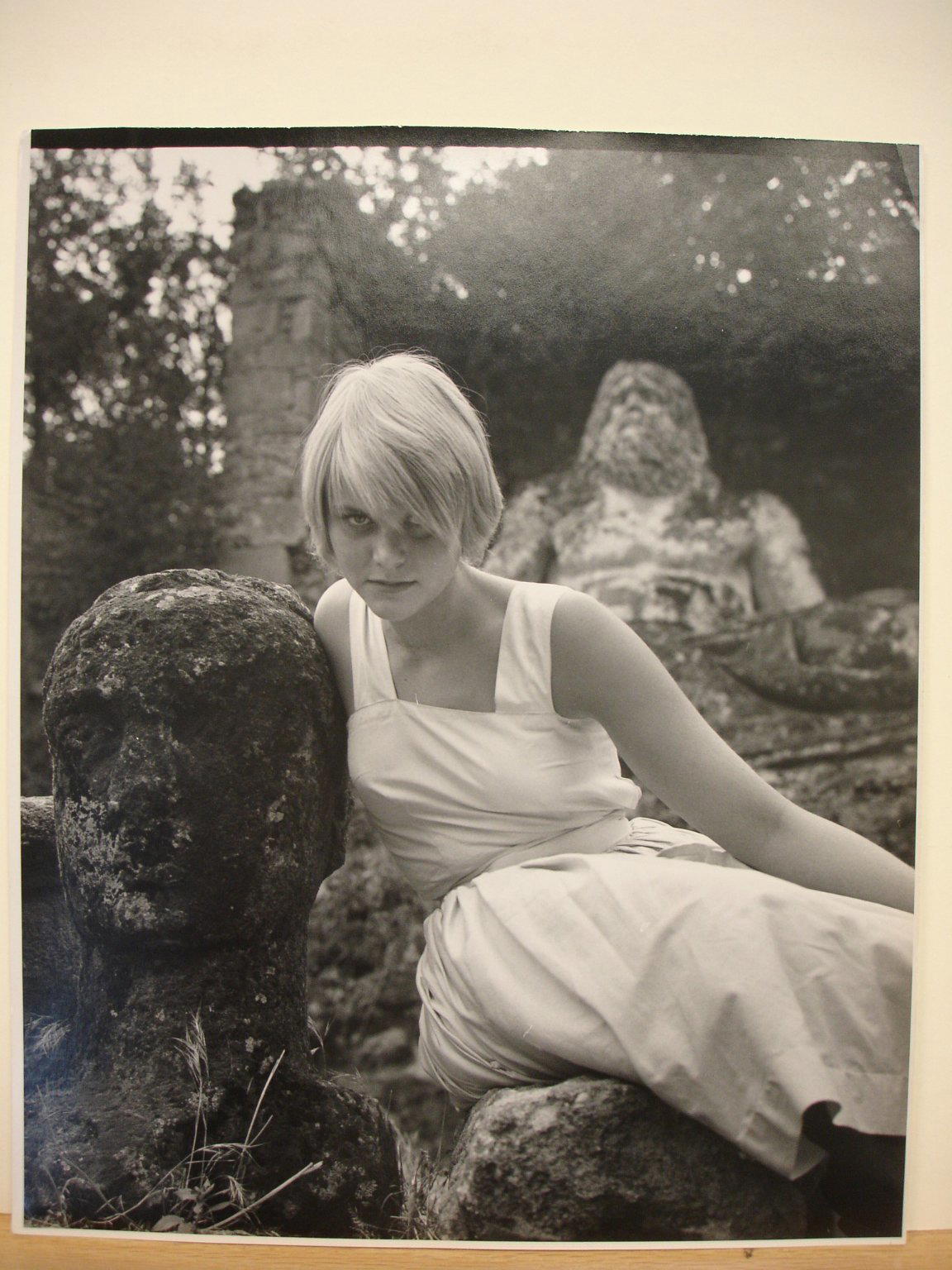Swedish Model (Blonde Woman in White Dress Leaning Against Statue of a Head)