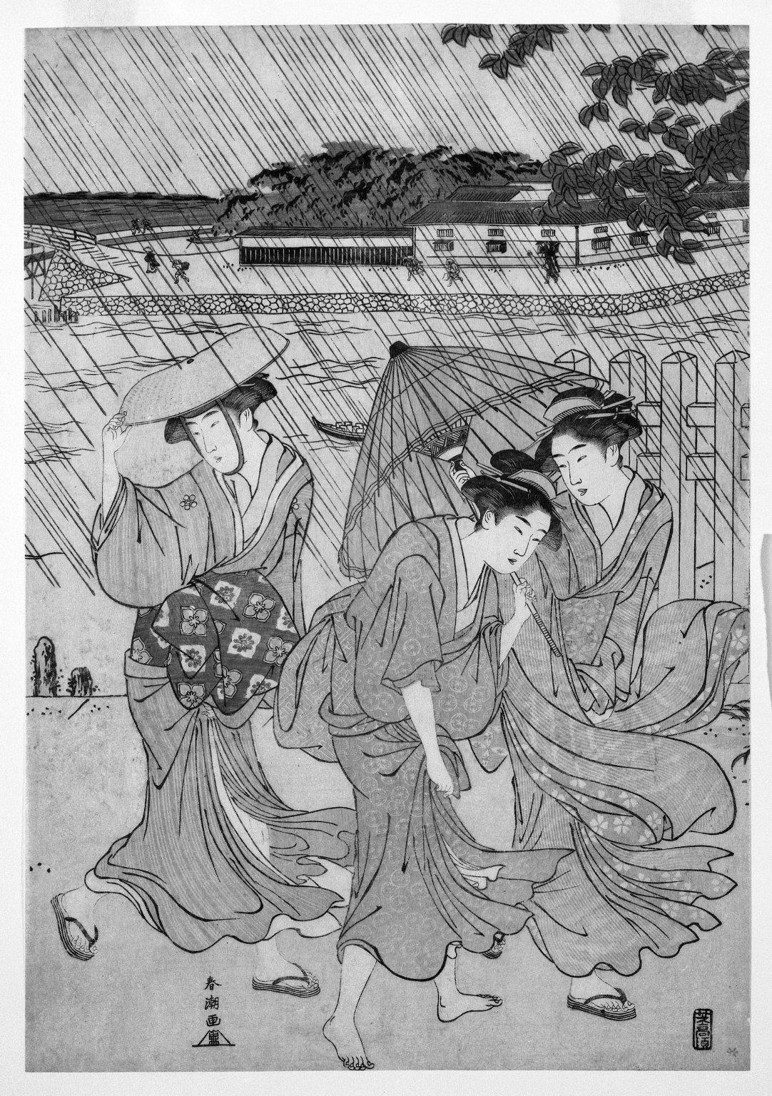 Yushid-o Shuncho (Japanese). Three Women on the Bank of a River in a Shower, 1789. Color woodblock print on paper, 14 5/16 x 9 15/16 in. (36.4 x 25.2 cm). Brooklyn Museum, Gift of Mr. and Mrs. Ran Hettena, 86.263.13. (Photo: Brooklyn Museum)