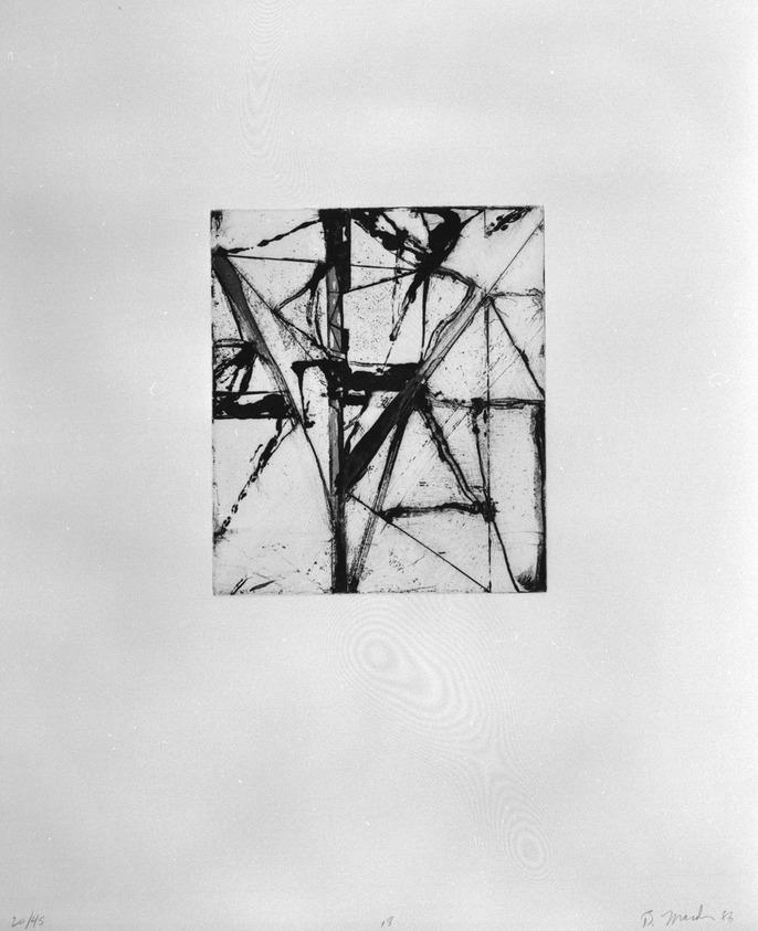 Brice Marden (American, 1938–2023). Print from "Etchings to Rexroth", 1986. Sugar lift, aquatint, open bite, drypoint and scraping on paper, sheet: 19 1/2 x 16 in. (49.5 x 40.6 cm) image: 8 x 6 3/4 in. (20.3 x 17.1 cm). Brooklyn Museum, Purchased with funds given by Henry and Cheryl Welt, 87.54.18. (Photo: Brooklyn Museum)