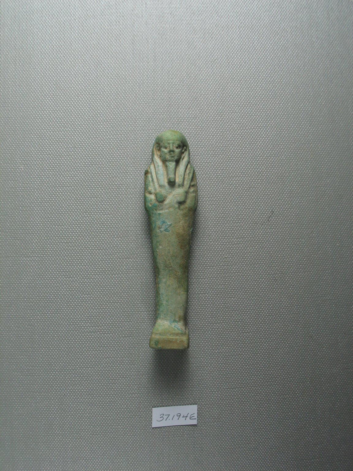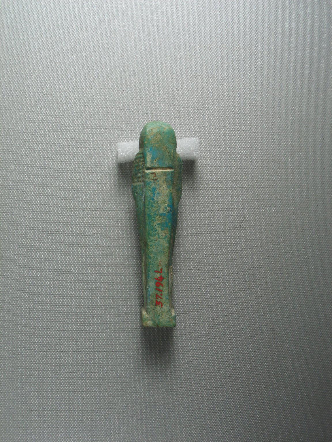 Uninscribed Ushabti, 664–525 B.C.E.. Faience, 4 1/8 x 1 x 13/16 in. (10.5 x 2.5 x 2 cm). Brooklyn Museum, Charles Edwin Wilbour Fund, 37.194E. (Photo: Brooklyn Museum)