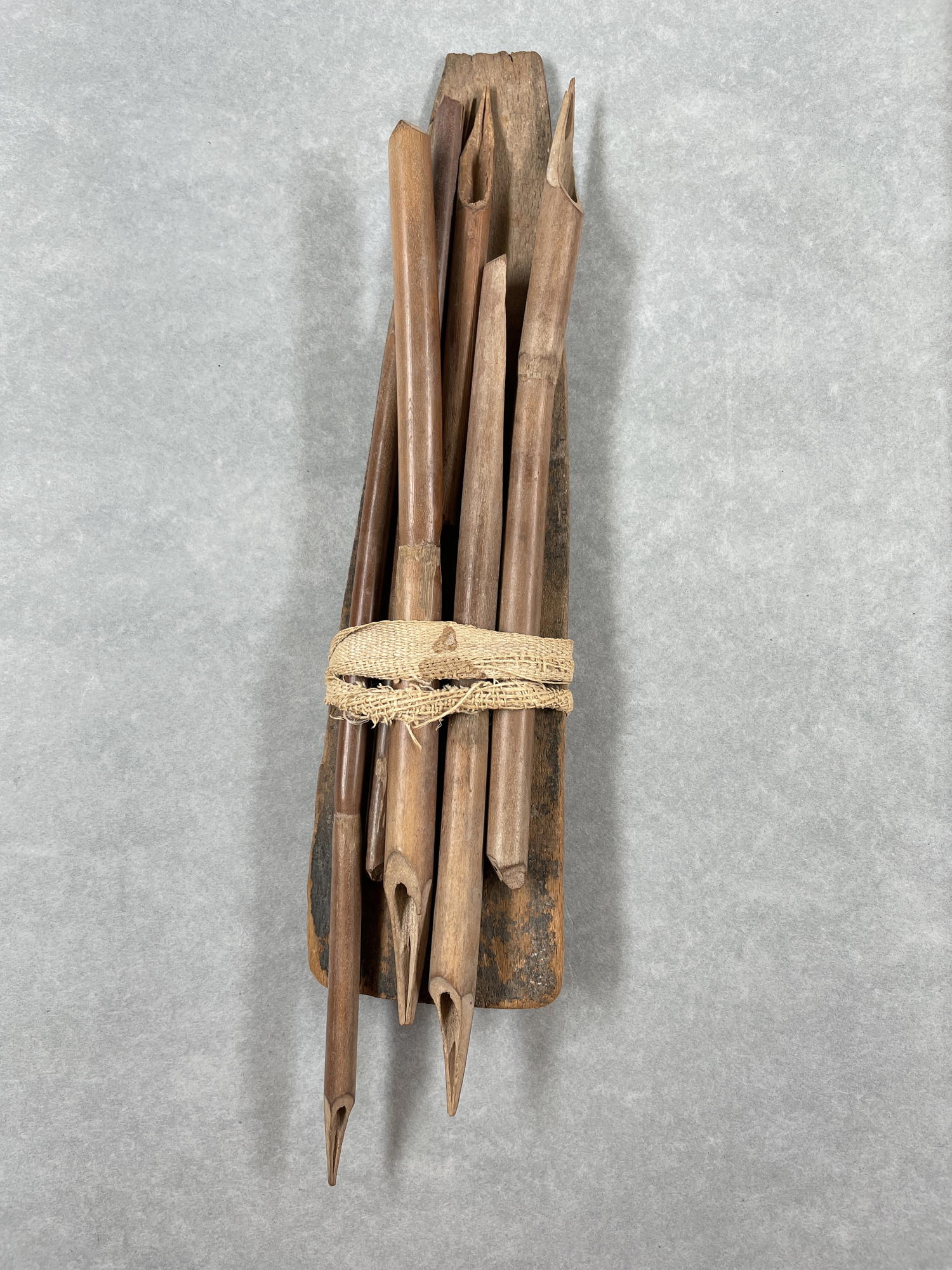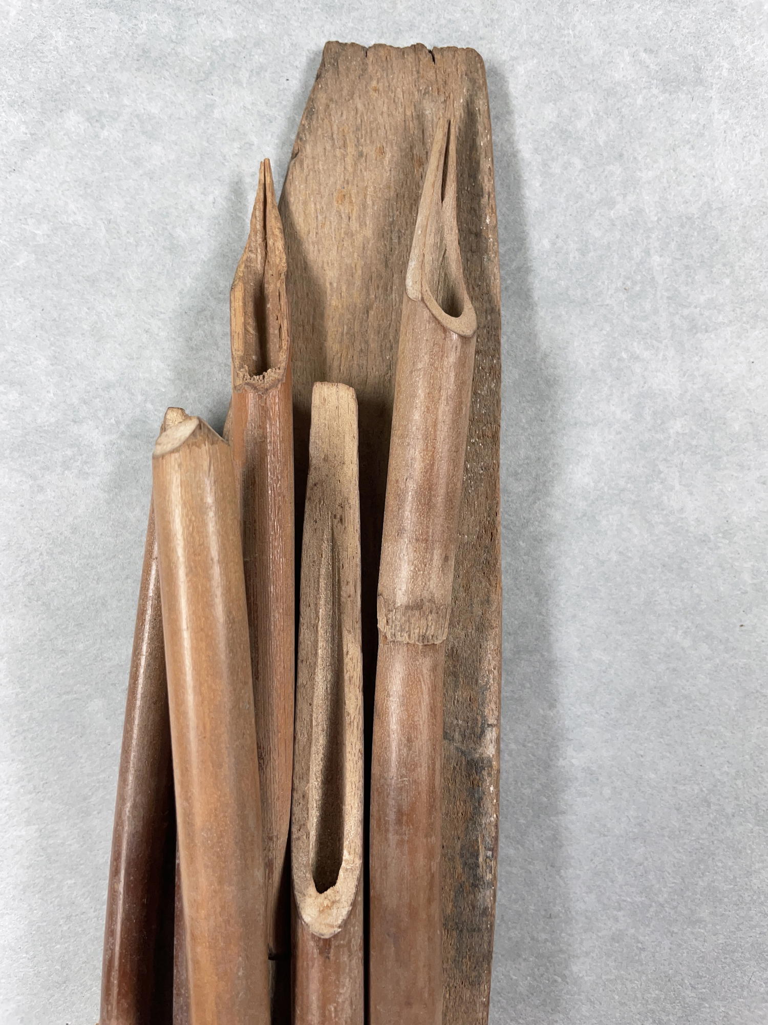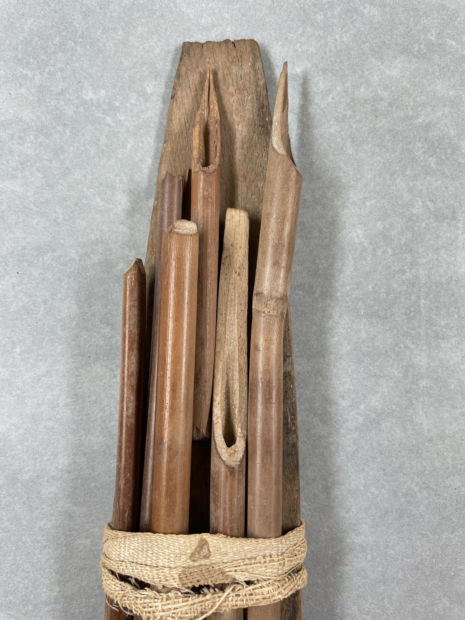 Scribe's Tool Bundle, 332 B.C.E–395 C.E.. Wood, reed, linen, 37.451Ea palette: 2 3/8 × 3/16 × 9 in. (6 × 0.4 × 22.8 cm) 37.451Eb pen: 1/4 × 7 7/8 in. (0.7 × 20 cm) 37.451Ec pen: 1/4 × 7 3/8 in. (0.6 × 18.7 cm) 37.451Ed pen: 7/16 × 8 1/16 in. (1.1 × 20.4 cm) 37.451Ee pen: 1/2 × 4 7/16 in. (1.3 × 11.3 cm) 37.451Ef pen: 1/4 × 7 11/16 in. (0.7 × 19.6 cm) 37.451Eg pen: 1/2 × 7 1/2 in. (1.2 × 19.1 cm) mount. Brooklyn Museum, Charles Edwin Wilbour Fund, 37.451Ea-h. (Photo: Brooklyn Museum)