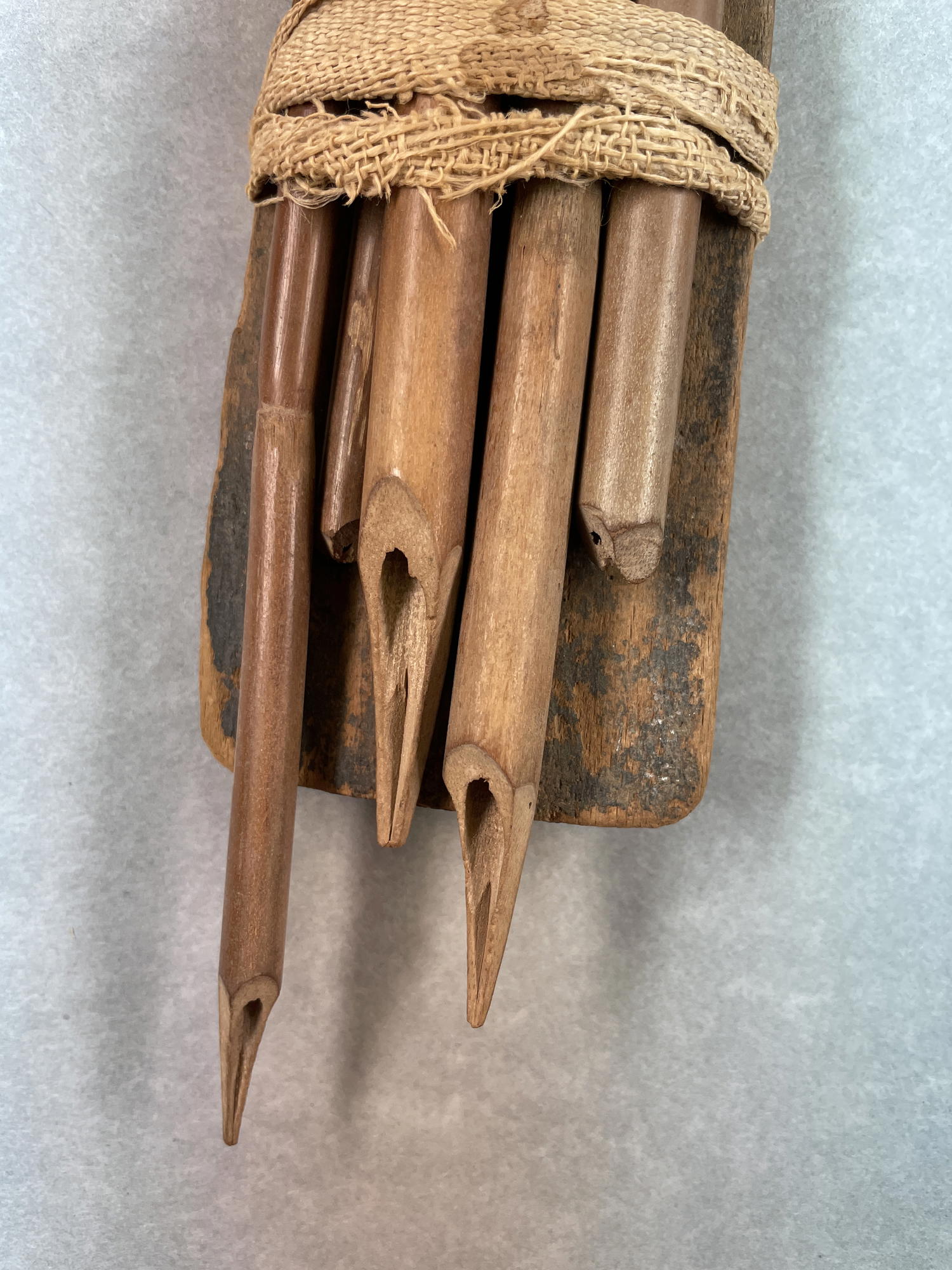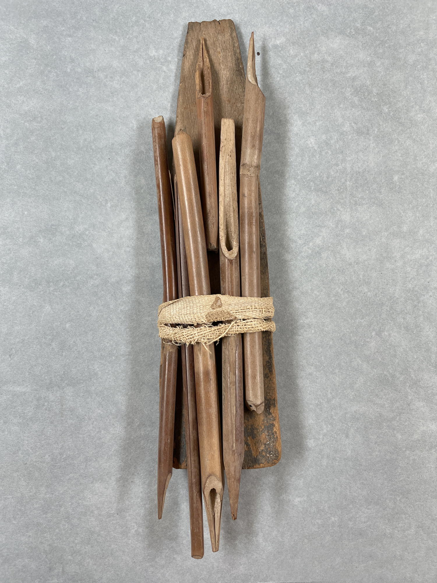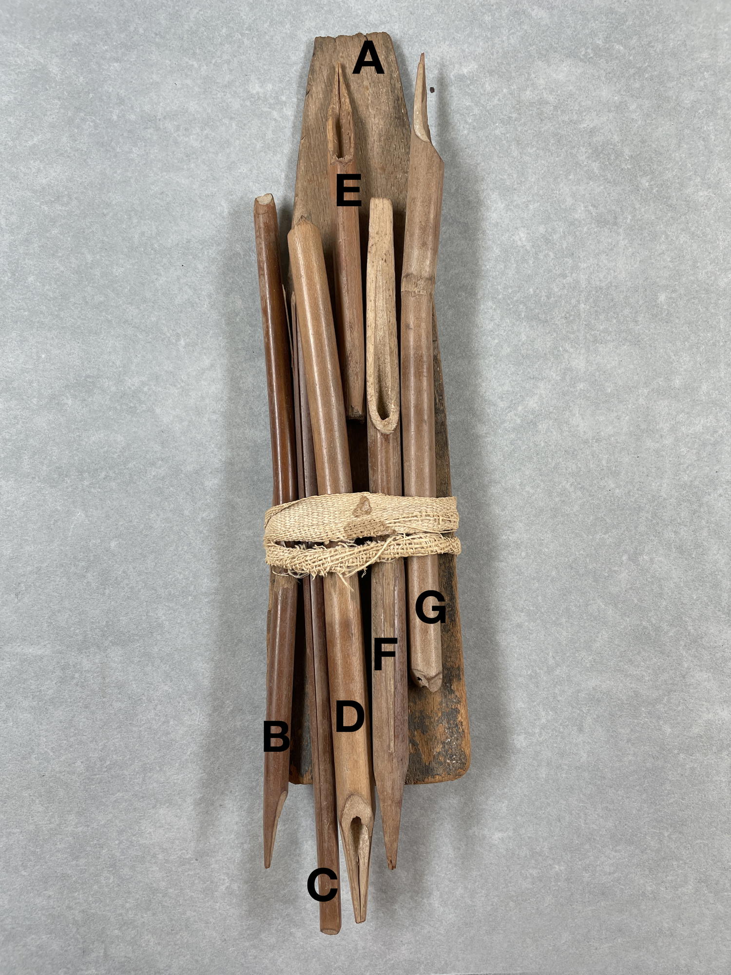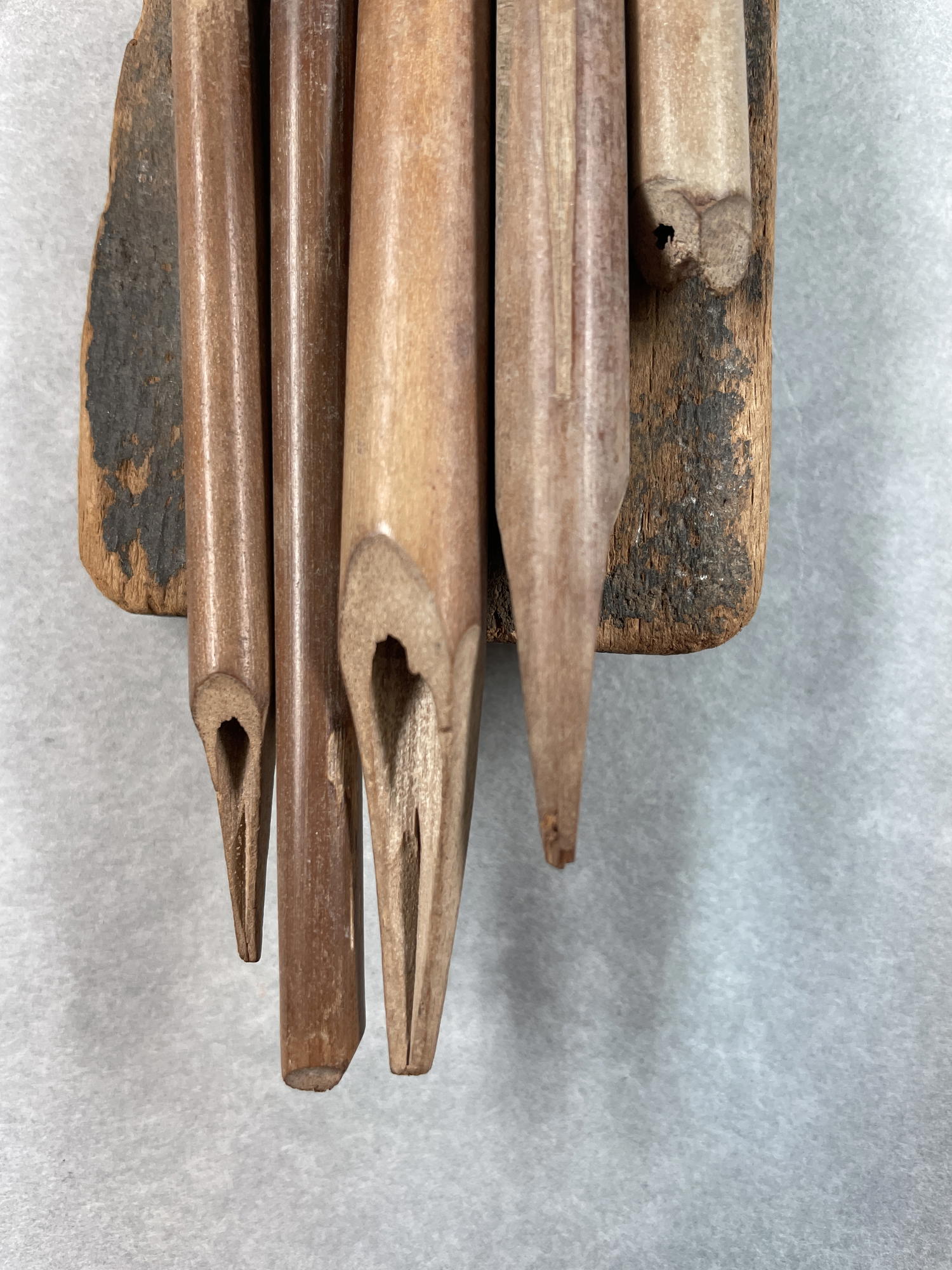 Scribe's Tool Bundle, 332 B.C.E–395 C.E.. Wood, reed, linen, 37.451Ea palette: 2 3/8 × 3/16 × 9 in. (6 × 0.4 × 22.8 cm) 37.451Eb pen: 1/4 × 7 7/8 in. (0.7 × 20 cm) 37.451Ec pen: 1/4 × 7 3/8 in. (0.6 × 18.7 cm) 37.451Ed pen: 7/16 × 8 1/16 in. (1.1 × 20.4 cm) 37.451Ee pen: 1/2 × 4 7/16 in. (1.3 × 11.3 cm) 37.451Ef pen: 1/4 × 7 11/16 in. (0.7 × 19.6 cm) 37.451Eg pen: 1/2 × 7 1/2 in. (1.2 × 19.1 cm) mount. Brooklyn Museum, Charles Edwin Wilbour Fund, 37.451Ea-h. (Photo: Brooklyn Museum)