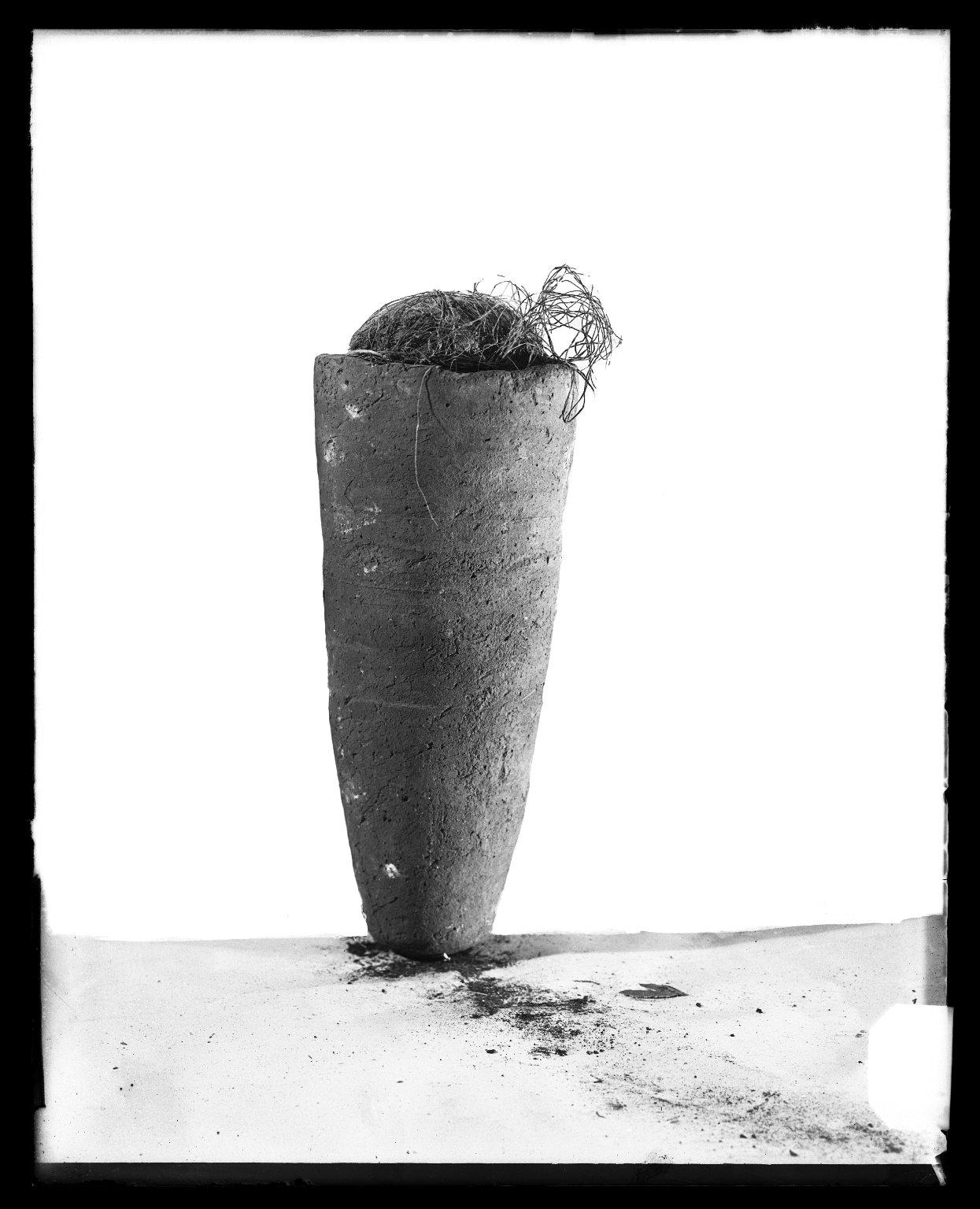 Ibis-form Mummy in Jar, 664–332 B.C.E.. Clay, animal remains, linen, 13 × 5 × 5 1/2 in. (33 × 12.7 × 14 cm) mummy: 12 1/2 × 4 × 3 in. (31.8 × 10.2 × 7.6 cm). Brooklyn Museum, Charles Edwin Wilbour Fund, 37.1953Ea-b. (Photo: Brooklyn Museum)