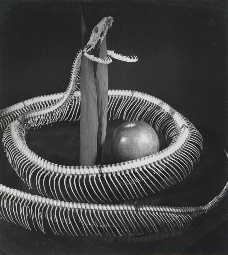 Pierre Jahan (French, 1909–2003). Snake Skeleton with Apple, early 1950s. Vintage gelatin silver print, 9 1/2 x 8 3/8 in. (24.1 x 21.3 cm). Brooklyn Museum, Gift of Eileen and Adam Boxer, 1989.190.1. (Photo: Brooklyn Museum)