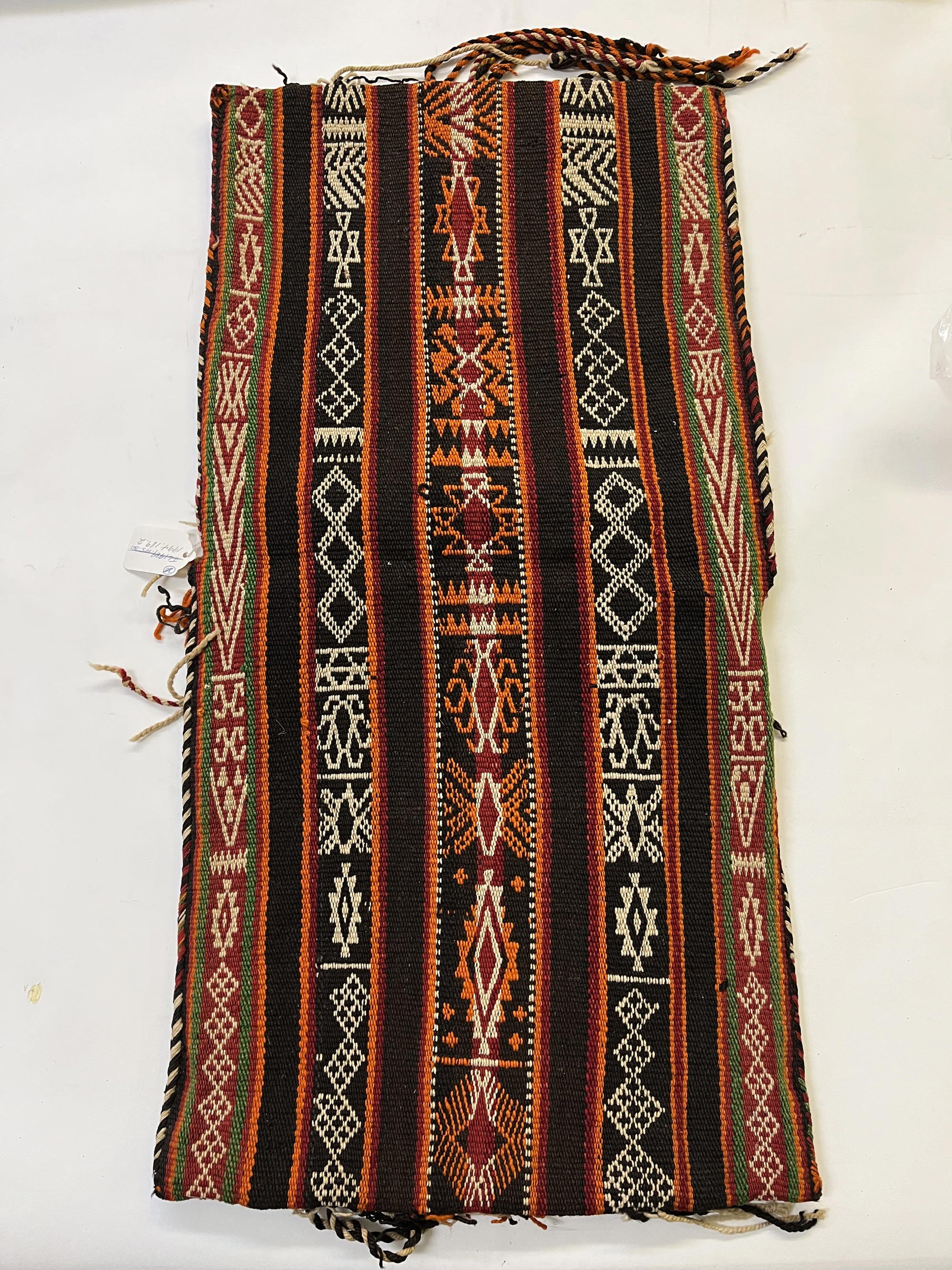 Iznagen Confederation; Amazigh. Saddle Bag, early 20th century. Wool, flat weave and brocade, 34 x 16 1/2 in. (86.4 x 41.9 cm). Brooklyn Museum, Gift of Dr. Virgil H. Bird, 1994.189.2. (Photo: Brooklyn Museum)