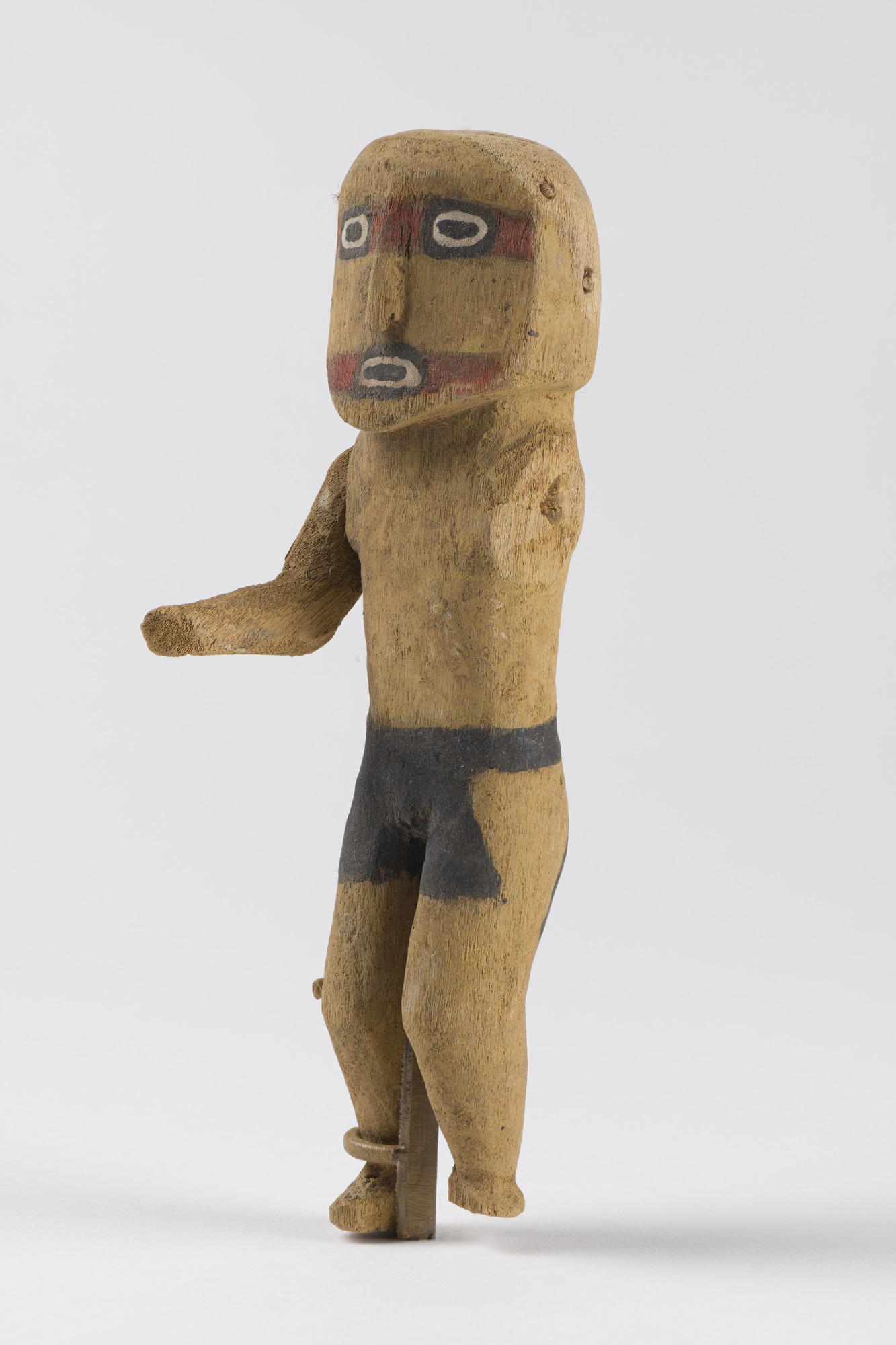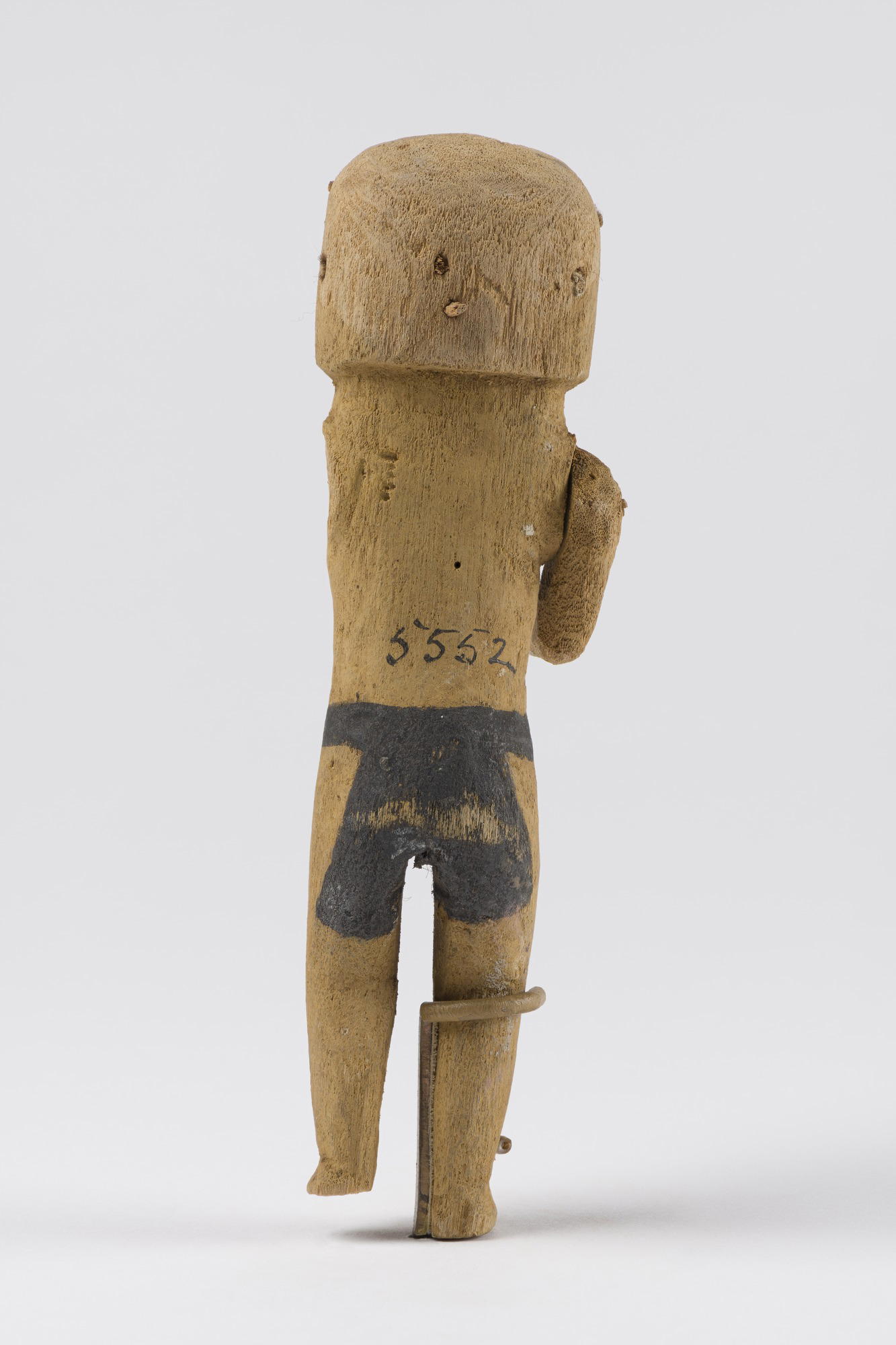 Hopi Pueblo. Kachina Doll (Tsuku), late 19th century. Wood, paint, 5 3/4 × 1 1/2 in. (14.6 × 3.8 cm) mount (2025 mount): 6 × 1 3/8 × 2 in. (15.2 × 3.5 × 5.1 cm). Brooklyn Museum, Museum Expedition 1904, Museum Collection Fund, 04.297.5552. (Photo: Brooklyn Museum)