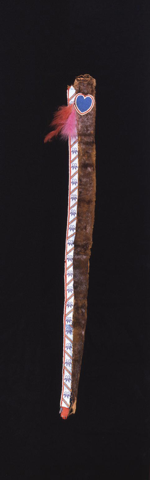 Osage. Cap Tail or Trailer, late 19th–early 20th century. Otter skin, wool trade cloth, glass beads, commercially woven cotton trade cloth, silk ribbons, hide, feathers, sinew, 54 x 6 in. (137.2 x 15.2 cm). Brooklyn Museum, Museum Expedition 1911, Museum Collection Fund, 11.694.8985. (Photo: Brooklyn Museum)