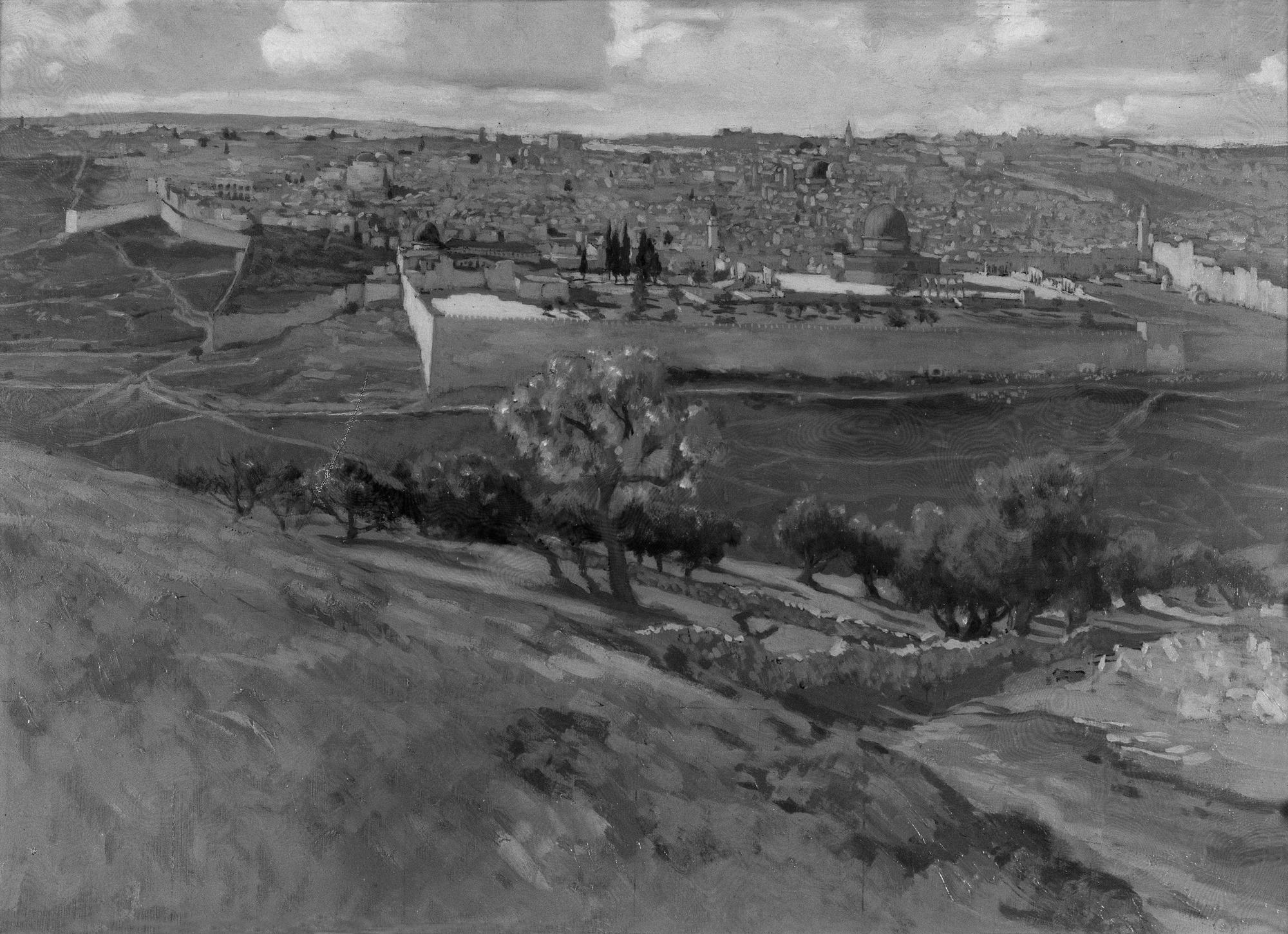 James Tissot (Nantes, France, 1836–1902, Chenecey–Buillon, France). Jerusalem from the Mount of Olives (Jérusalem. Prise du mont des Oliviers), 1886–1894. Oil on board, 14 1/2 × 20 3/8 in. (36.8 × 51.8 cm) frame: 21 × 27 × 2 in. (53.3 × 68.6 × 5.1 cm). Brooklyn Museum, Purchased by public subscription, 00.159.1. (Photo: Brooklyn Museum)