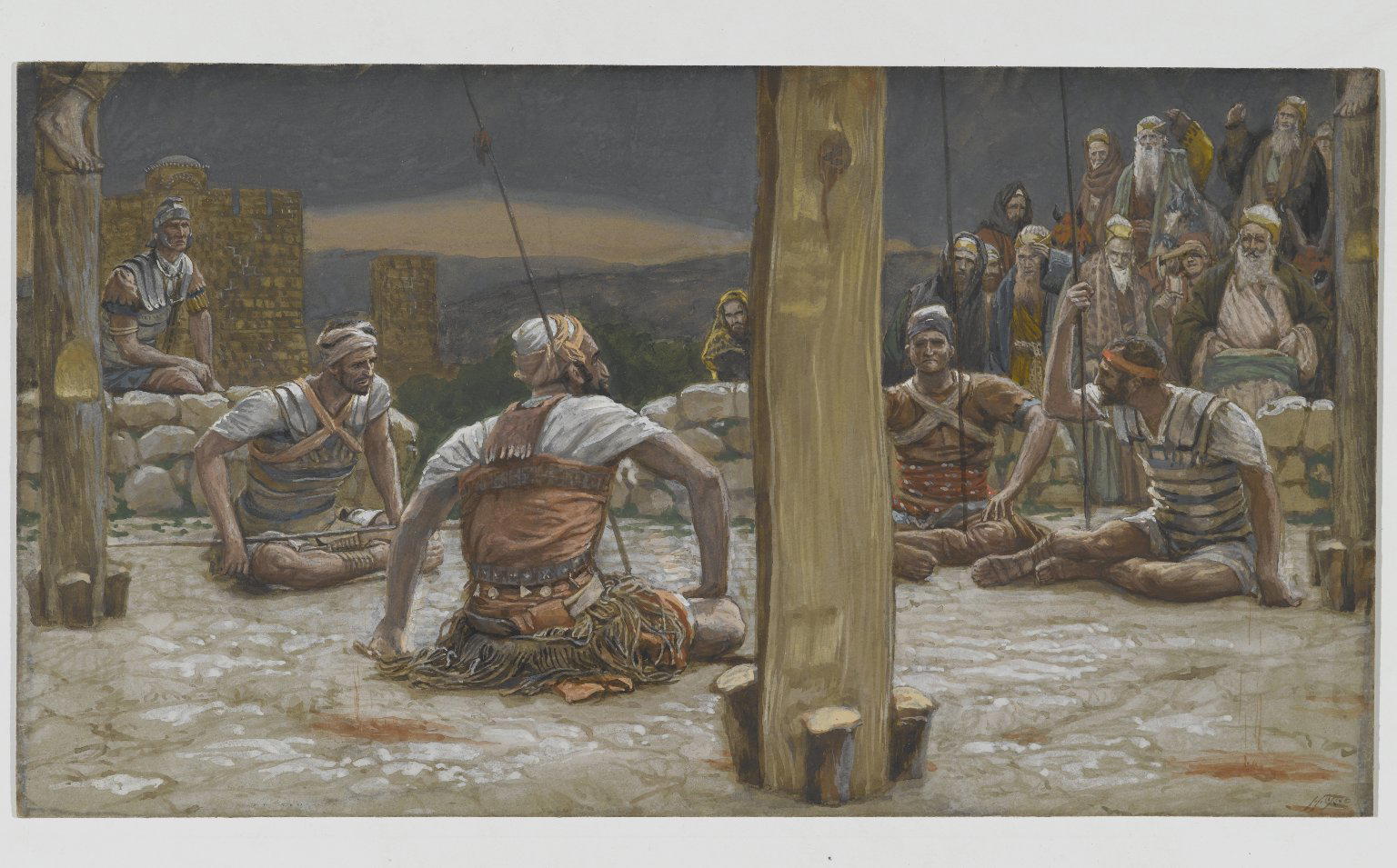 James Tissot (Nantes, France, 1836–1902, Chenecey–Buillon, France). The Four Guards Sat Down and Watched Him (Les quatre gardes s'assirent et le gardèrent), 1886–1894. Opaque watercolor over graphite on gray wove paper, Image: 5 3/4 x 10 3/8 in. (14.6 x 26.4 cm) Sheet: 5 3/4 x 10 3/8 in. (14.6 x 26.4 cm). Brooklyn Museum, Purchased by public subscription, 00.159.298. (Photo: Brooklyn Museum)