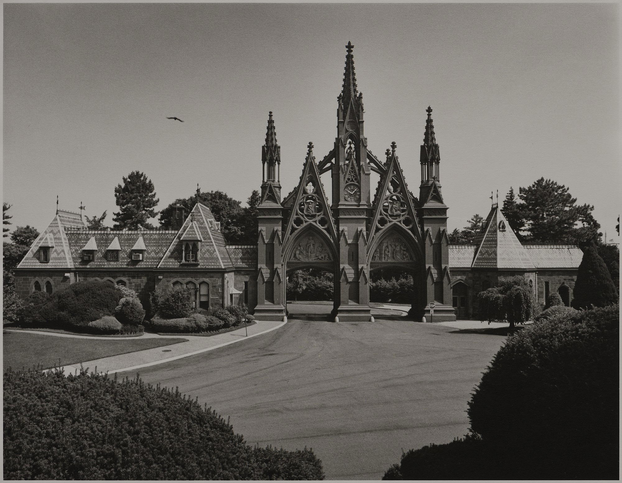 Tony Velez (American, 1946 – 2016). Entrance Gates to Greenwood Cemetery, Sunset Park, (5th Avenue and 23rd Street), Brooklyn, NY, 1 of 20 from a Portfolio of 34, 1990. Gelatin silver print, Image:10-3/8 x 13-3/8 in. (26.4 x 34cm) Sheet: 11 x 14 in. (27.9 x 35.6 cm). Brooklyn Museum, Gift of Victor H. Kempster, 1991.306.9. © Tony Velez. (Photo: Brooklyn Museum)