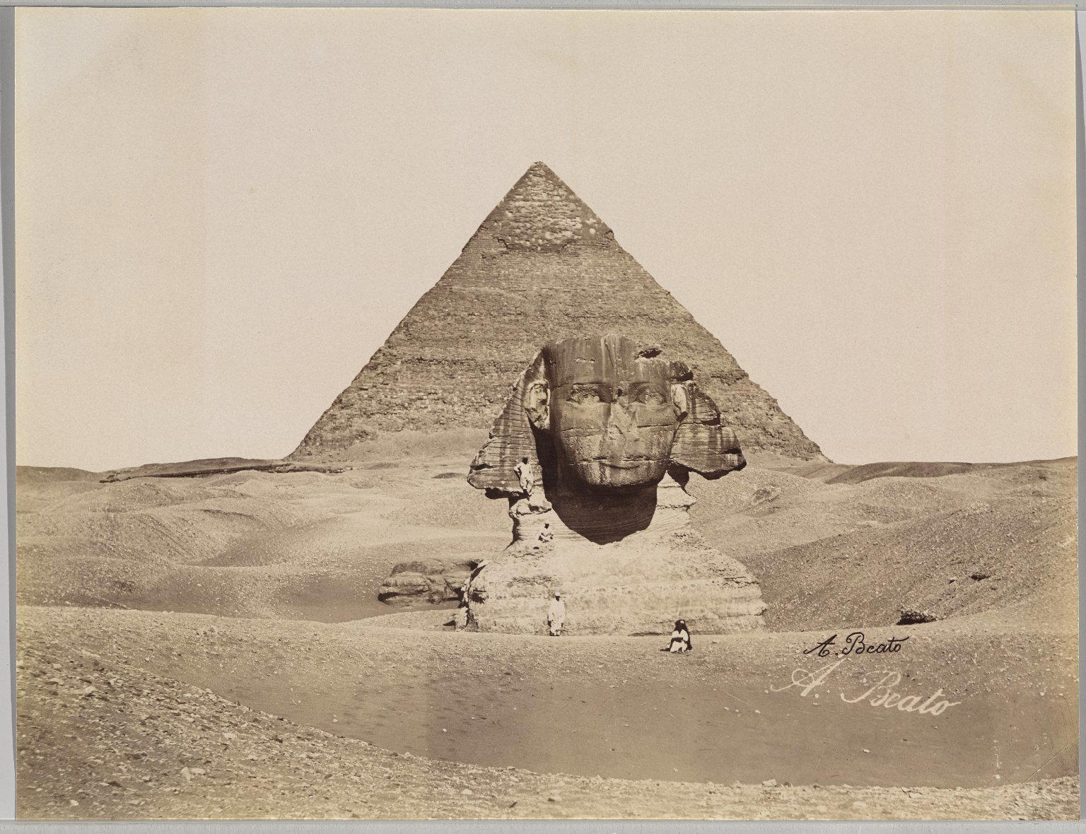 Antonio Beato (Italian and British, ca. 1825–ca.1903). Sphinx et la Pyramide de Chephren, n.d.. Albumen silver print, 7 7/8 x 10 1/4 in. (20.0 x 26.0 cm). Brooklyn Museum, Gift of Virginia M. Zabriskie, 1991.310.2. (Photo: Brooklyn Museum)