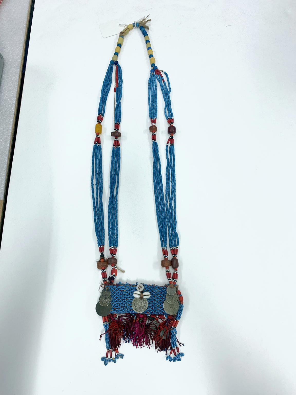 Artificial beads, shells, amber, coins, and embroidered cotton