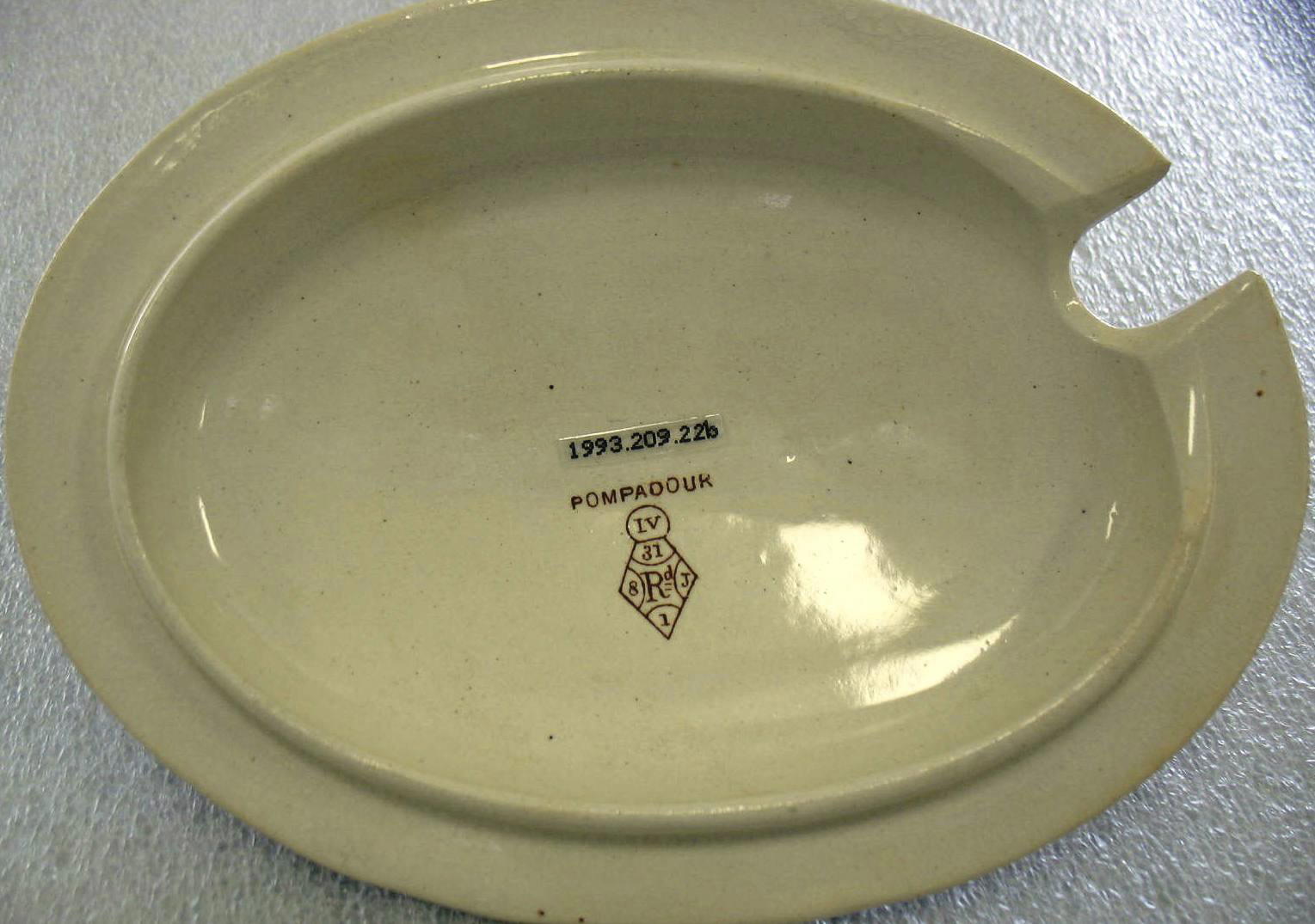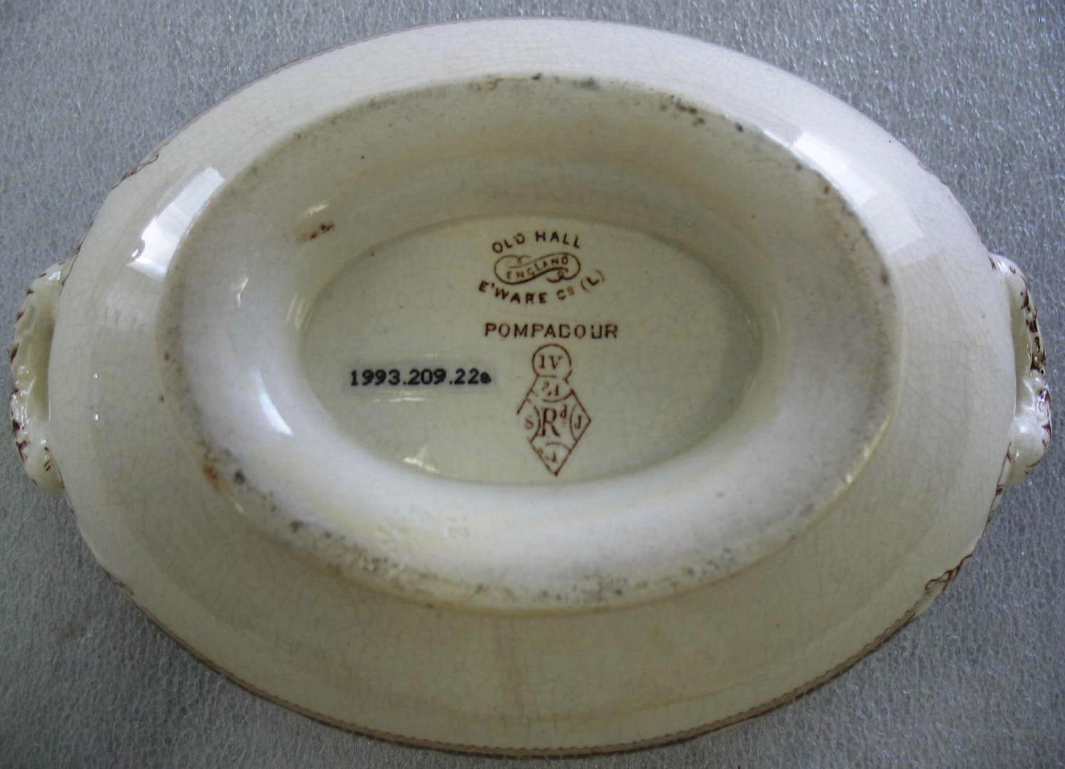 (A) Printed in brown on center back: "OLD HALL" over "ENGLAND" set into banner over "E'WARE Co (L)" Below, "POMPADOUR" over semicircle fused with diamond, clockwise from top of semicircle to diamond center: "IV / 31 / J / 1 / 8 / Rd" (B) Printed in brown on underside of lid: "POMPADOUR" over semicircle fused with diamond, clockwise from top of semicircle to diamond center: "IV / 31 / J / 1 / 8 / Rd" Imprinted on underside of lid: "22"