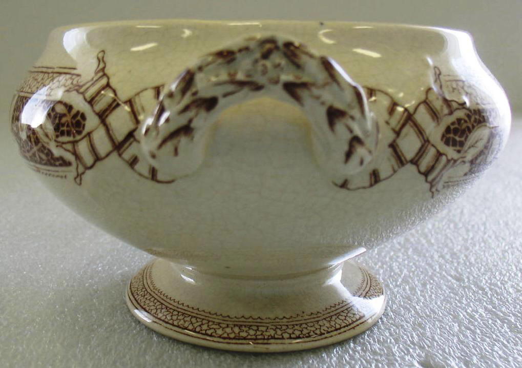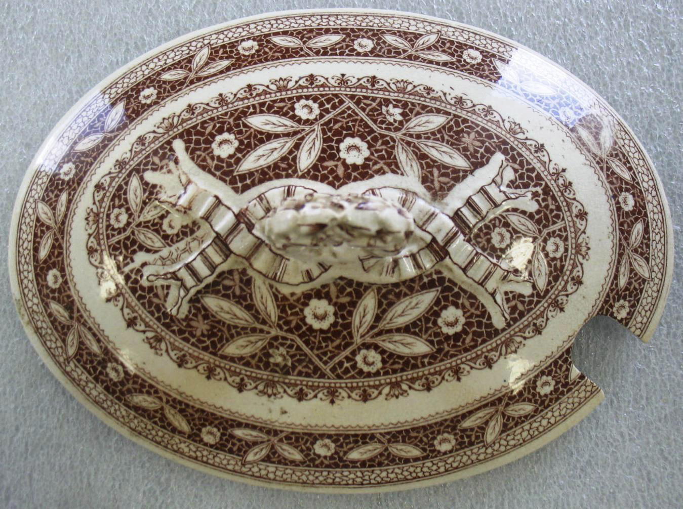 Old Hall Earthenware Co. (1861–1886). Tureen with Lid; Pompadour Pattern, 1880. Glazed earthenware with transfer printed decoration, tureen: 3 1/4 x 9 x 6 in. (8.2 x 22.9 x 15.2 cm) lid: 2 1/2 x 7 1/2 x 5 1/2 in. (6.4 x 19.0 x 14.0 cm). Brooklyn Museum, Gift of Paul F. Walter, 1993.209.22a-b. (Photo: Brooklyn Museum)