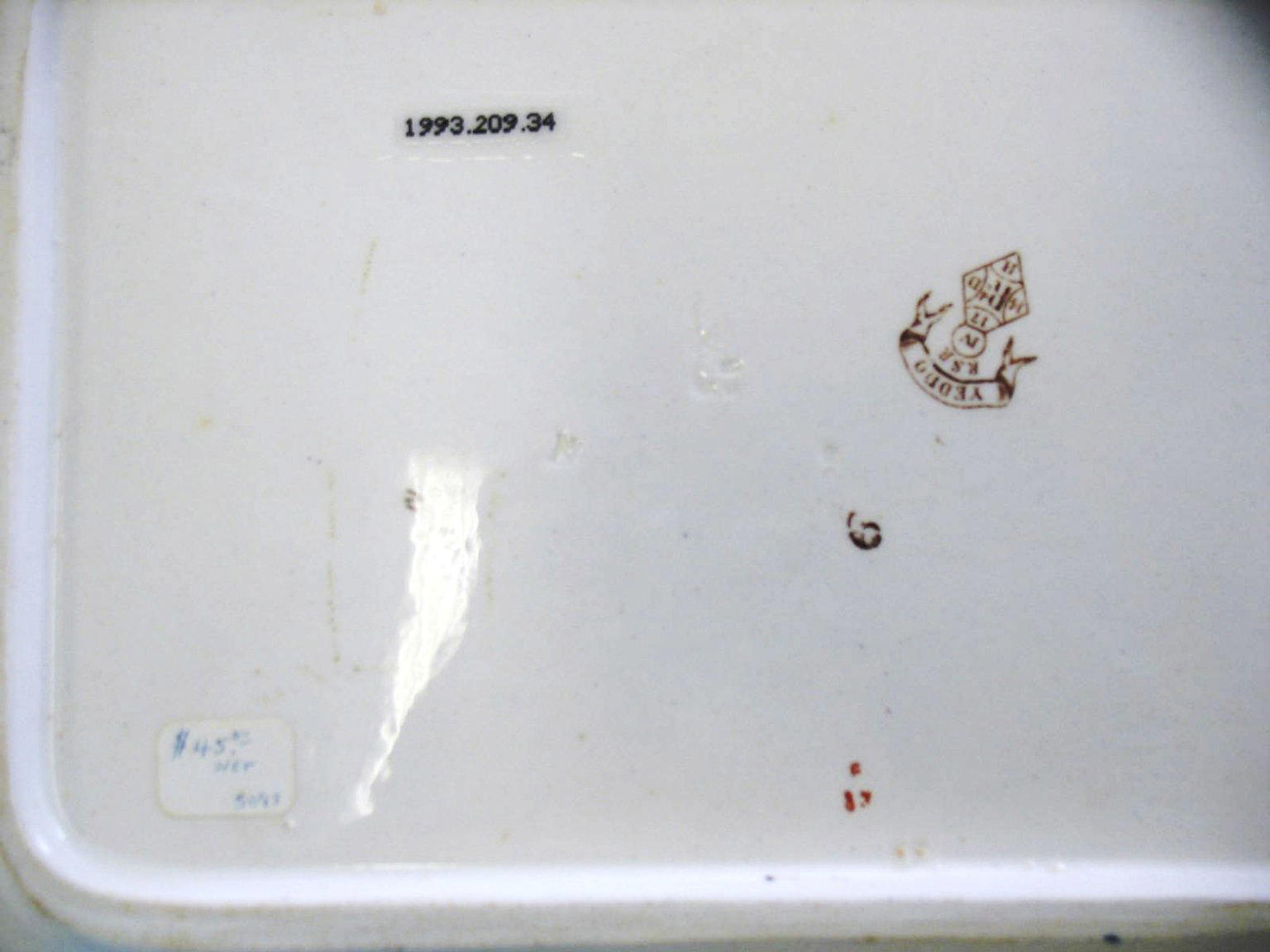 Painted in black on center back: "IV", "6" Painted in red on center back: "F / 8.7" Written in blue ink on paper label on center back: "45.00 / net / 5097" Printed on center back: [Logo of semi-circle fused with diamond], clockwise from top of semicircle to diamond center: "IV / 17 / D / H / 14 / Rd". Above logo in banner, "YEDDO", below, "RSR" Imprinted on center back "N", "[Illeg]"