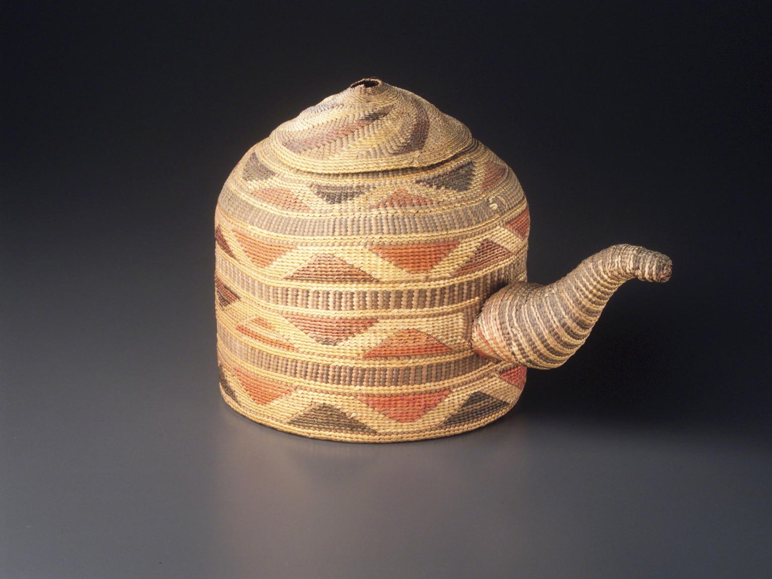 Tlingit. Basketry Teapot with Lid, first half 20th century. Spruce root, grass, dye, 7 x 9 7/8 x 6 1/8 in. (17.8 x 25.1 x 15.6 cm). Brooklyn Museum, Gift of Phyllis H. Shreeve, 1994.185a-b. (Photo: Brooklyn Museum)