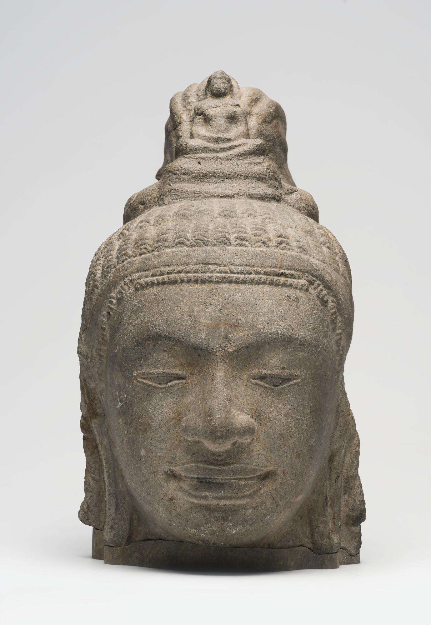 With its round, soft features and narrow eyes, this head is typical of the earliest Cambodian stone sculptures. In this period, Cambodian rulers strove to adopt and emulate aspects of Indian culture that had traveled to Southeast Asia via maritime trade and missionaries. Most of the sculptures from this early period are Hindu in subject matter, whereas the seated Buddha atop this head indicates that it represents a Buddhist deity. It is likely that this image originally represented a Hindu deity, probably the god Vishnu, who wears a tall crown, and that it was repurposed as a Buddhist image at a later date by carving the Buddha into the stone of the crown.