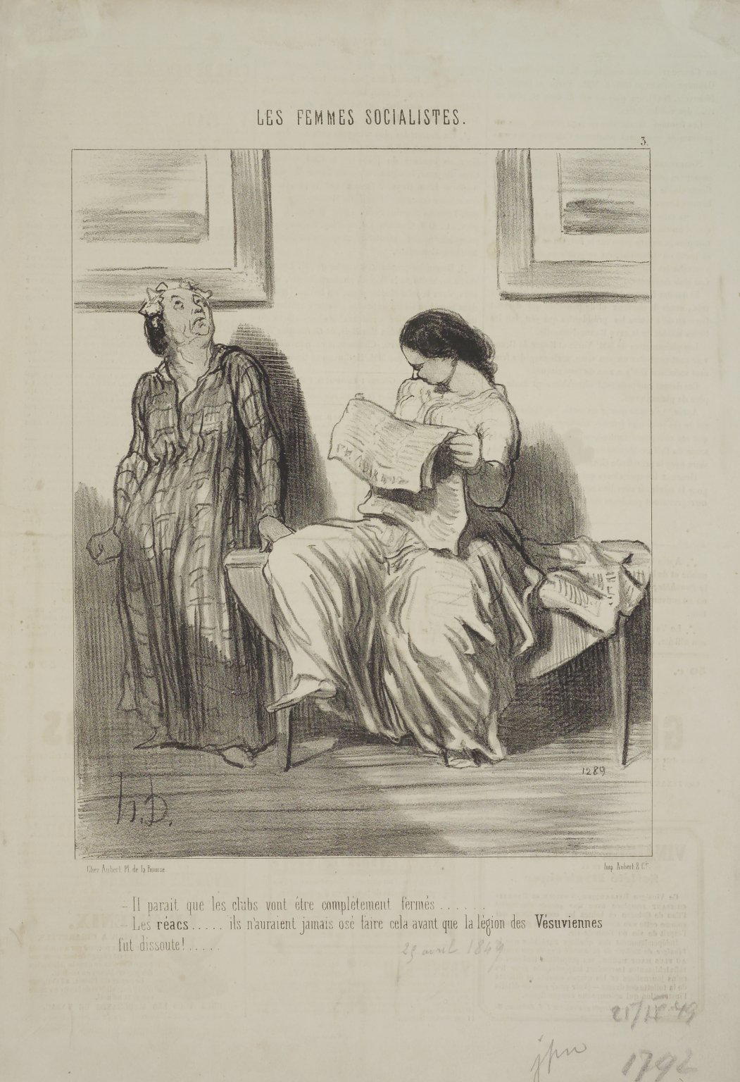 Top center above the image: "LES FEMMES SOCIALISTES."; top right above the image: "3."; lower right in stone: "1289"; lower left below image: "Chez Aubert Pl. de la Bourse."; lower right below the image: Imp. Aubert & Cie."; lower center below the image: "- Il parait que les clubs vont être complètement fermés...../ - Les réacs..... ils n'auraient jamais osé faire cela avant que la légion des Vésuviennes/fut dissoute!...."